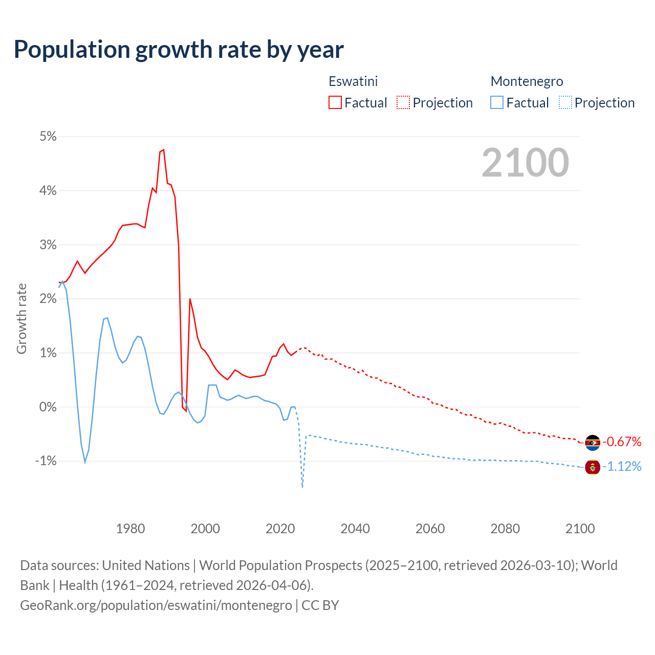 - For the last 10 years, Eswatini has had an average growth rate of +0.87% per year vs +0.01% in Montenegro.