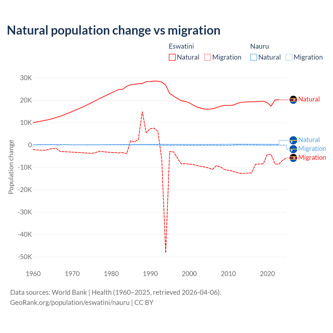 Over the last 10 years, 68.3% of the population change in Eswatini is from natural causes (a gain of 192,206 people) and 31.7% is from migration (a loss of 89,012 people). In Nauru 66.2% is from natural causes (a gain of 2,590 people) and 33.8% is from migration (a loss of 1,320 people).