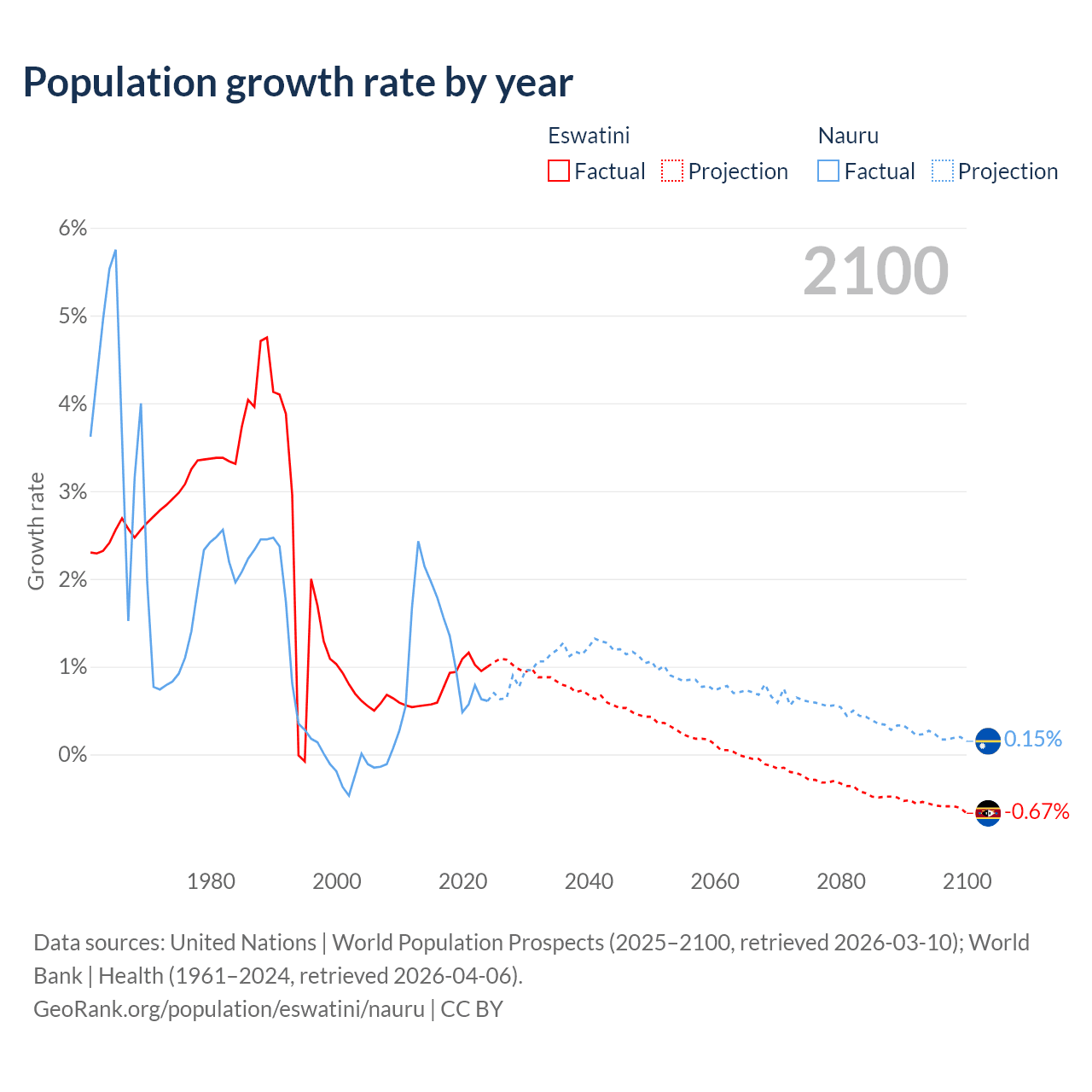 - For the last 10 years, Eswatini has had an average growth rate of +0.87% per year vs +1.17% in Nauru.