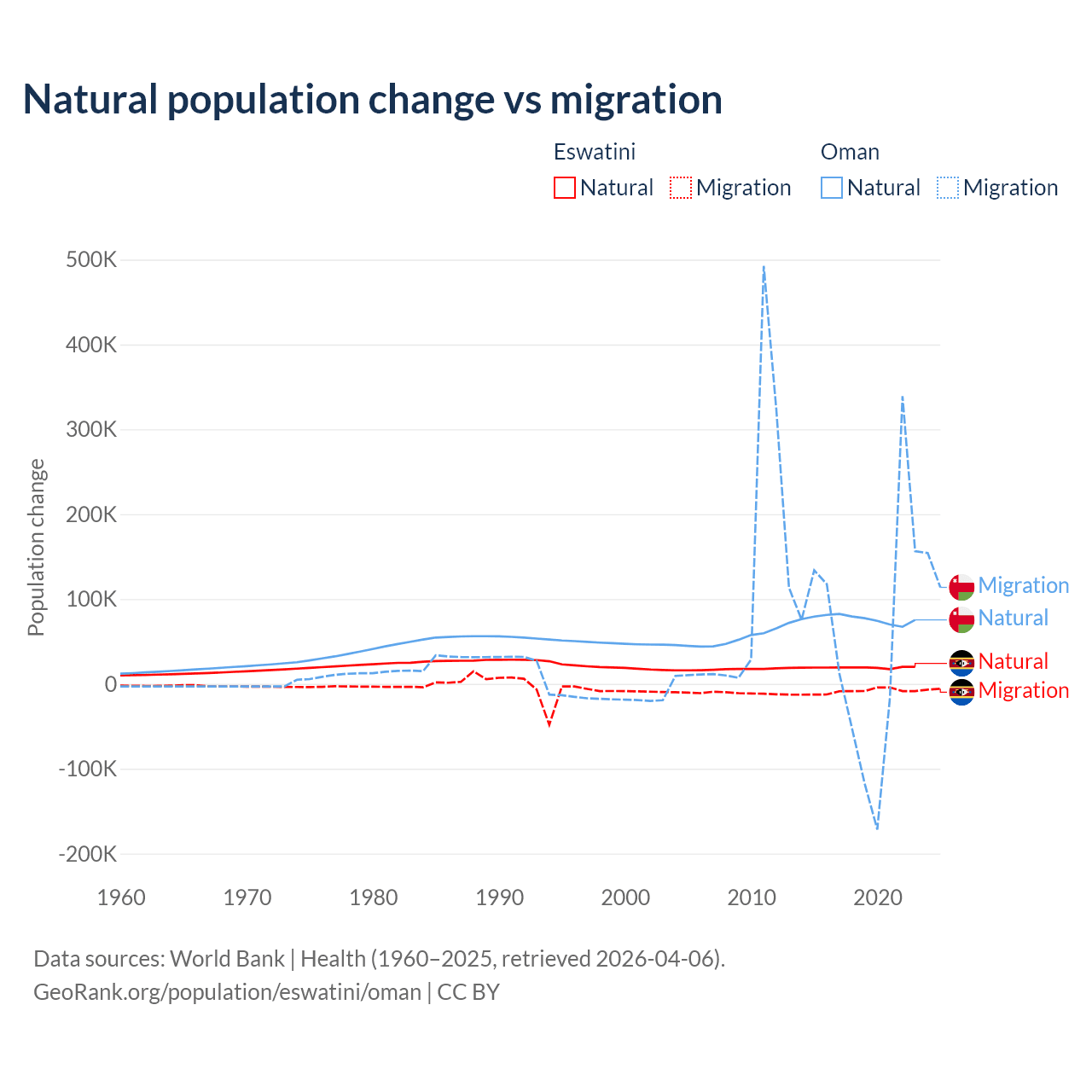 Over the last 10 years, 68.3% of the population change in Eswatini is from natural causes (a gain of 192,206 people) and 31.7% is from migration (a loss of 89,012 people). In Oman 61.6% is from natural causes (a gain of 763,049 people) and 38.4% is from migration (a gain of 475,565 people).