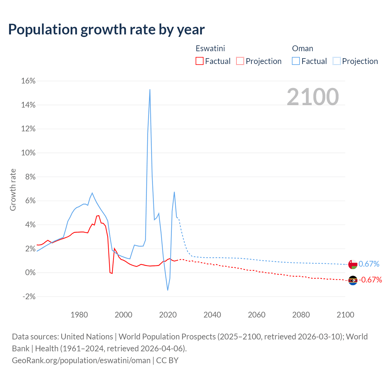 - For the last 10 years, Eswatini has had an average growth rate of +0.87% per year vs +2.99% in Oman.