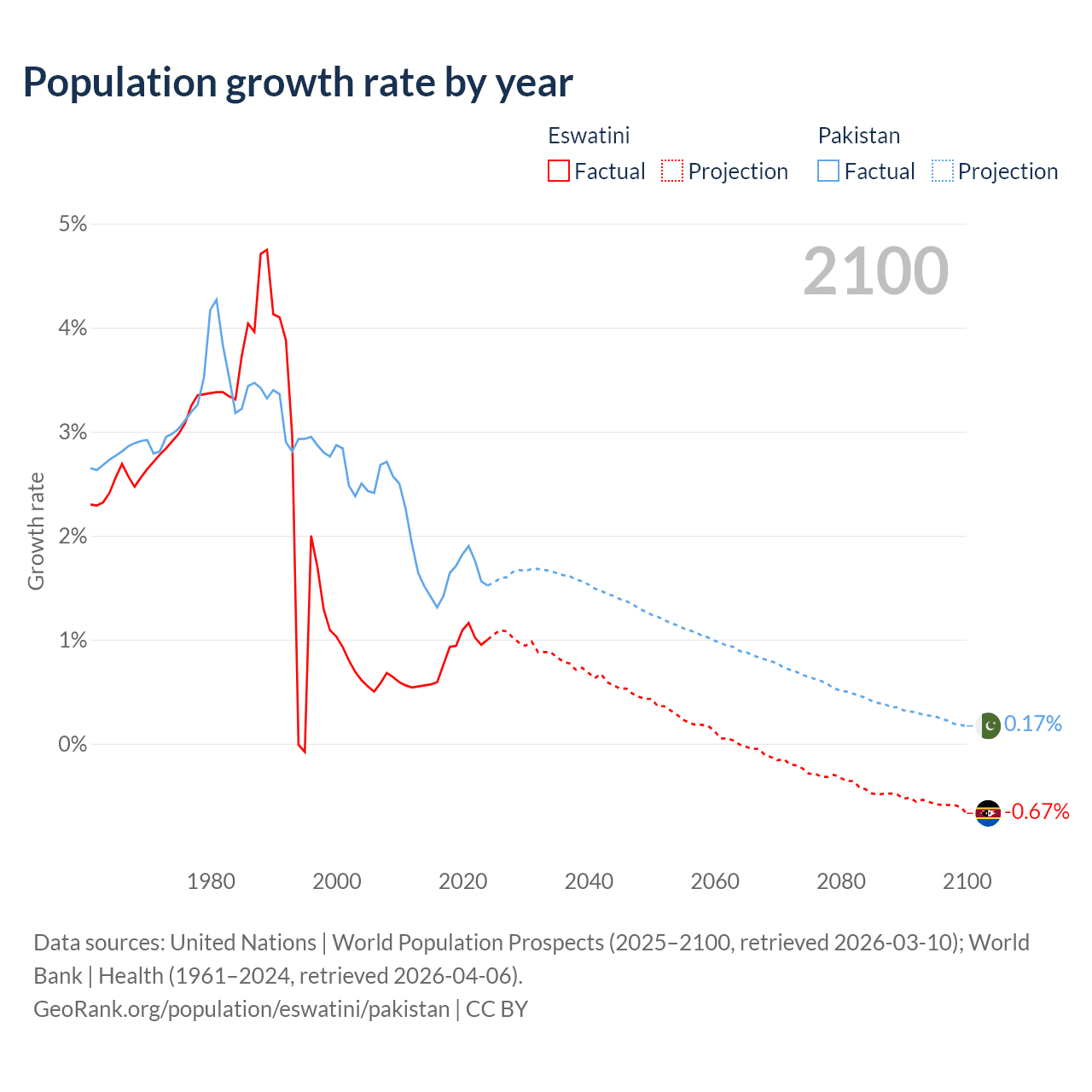 - For the last 10 years, Eswatini has had an average growth rate of +0.87% per year vs +1.6% in Pakistan.