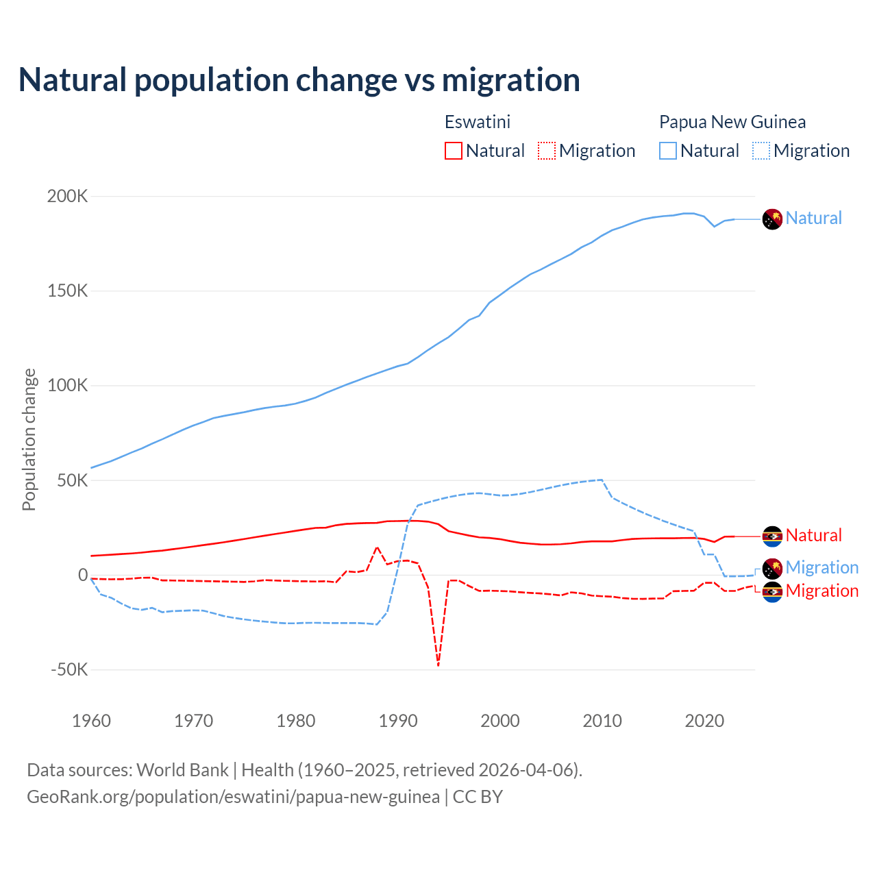 Over the last 10 years, 68.3% of the population change in Eswatini is from natural causes (a gain of 192,206 people) and 31.7% is from migration (a loss of 89,012 people). In Papua New Guinea 91% is from natural causes (a gain of 1,883,906 people) and 8.98% is from migration (a gain of 185,900 people).