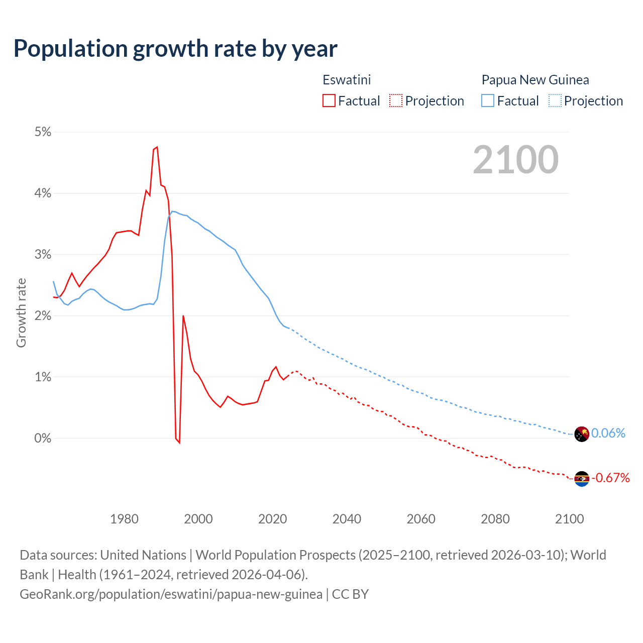 - For the last 10 years, Eswatini has had an average growth rate of +0.87% per year vs +2.23% in Papua New Guinea.