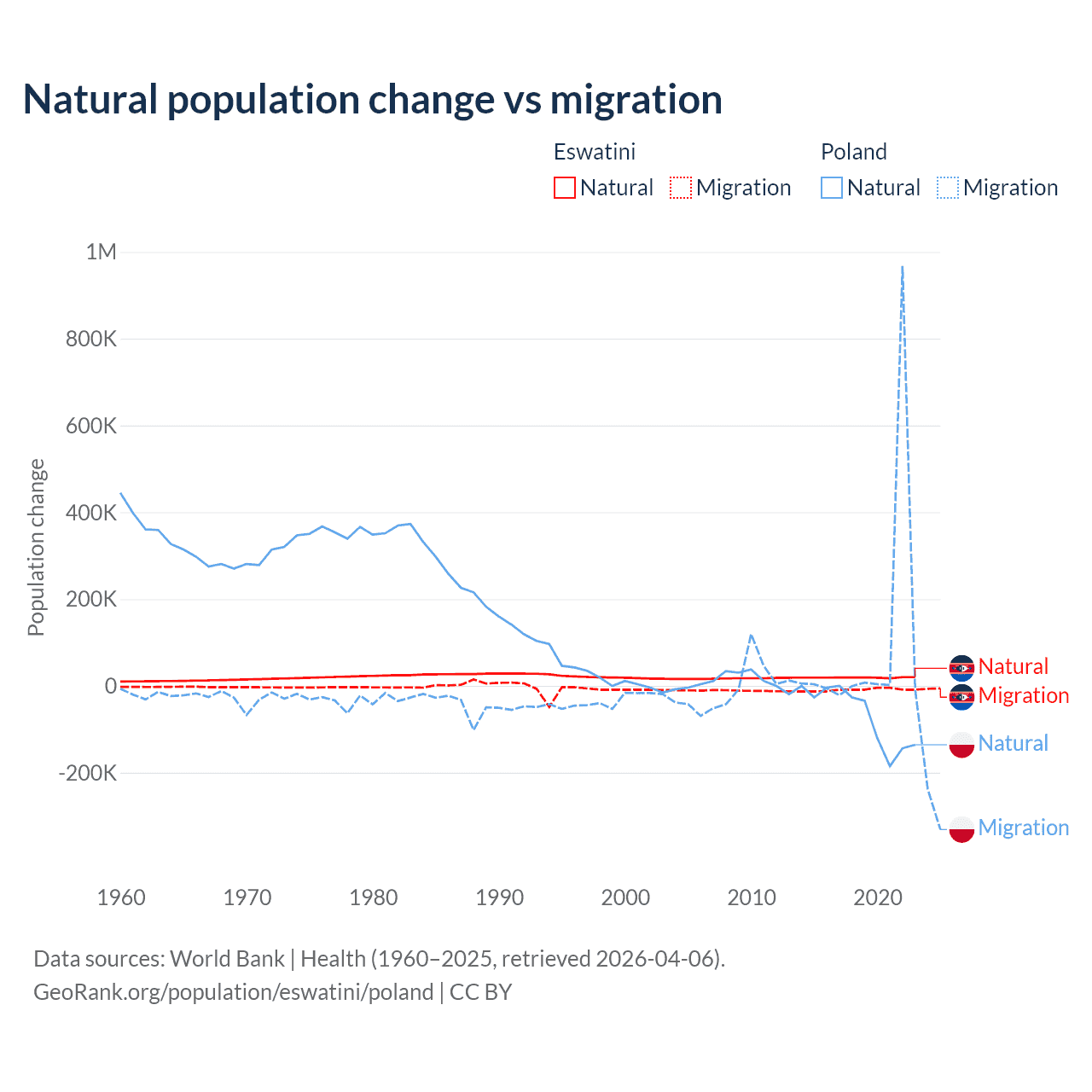 Over the last 10 years, 68.3% of the population change in Eswatini is from natural causes (a gain of 192,206 people) and 31.7% is from migration (a loss of 89,012 people). In Poland 41.4% is from natural causes (a loss of 675,443 people) and 58.6% is from migration (a gain of 955,766 people).