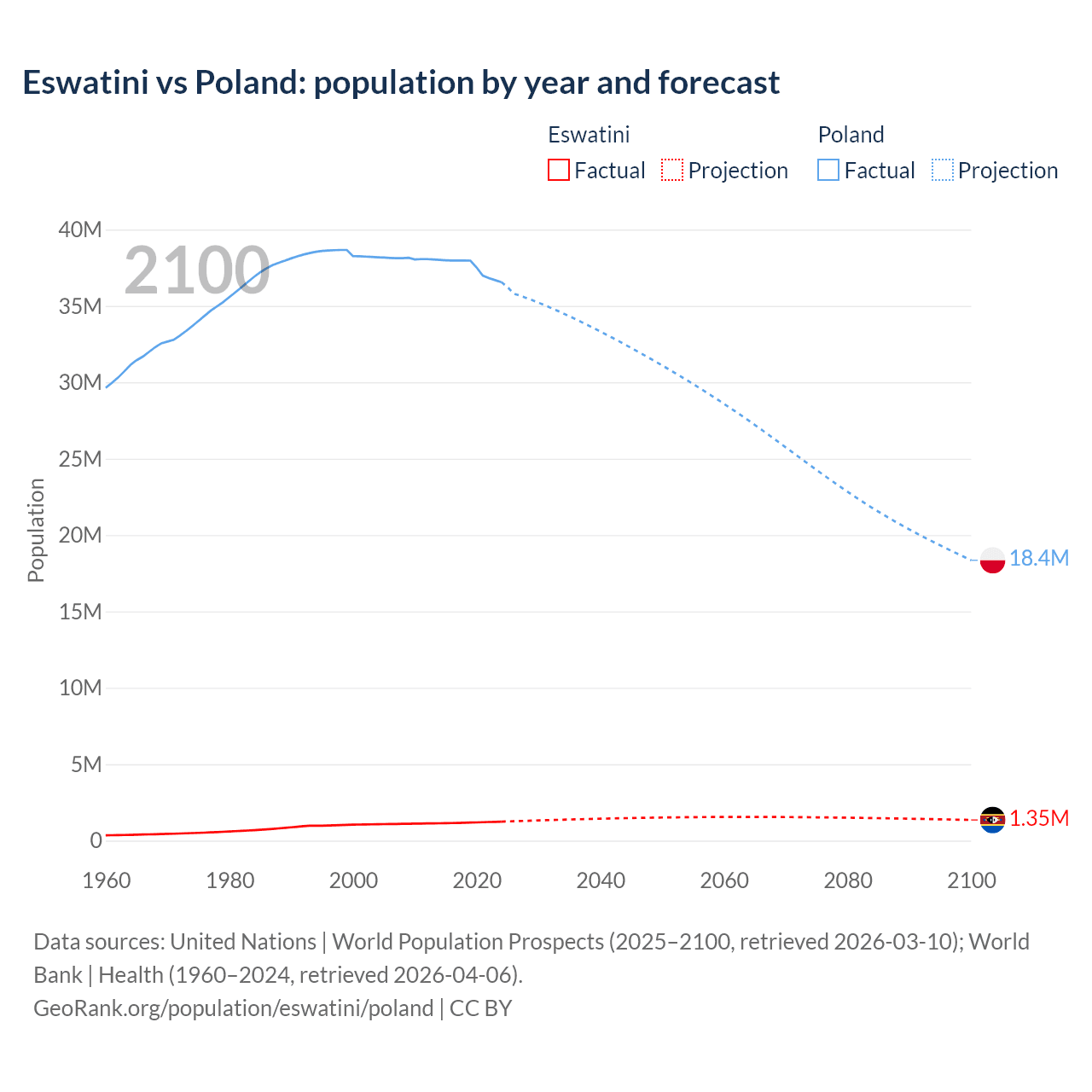 - Since 2006, the population of Eswatini has increased from 1.08M people to 1.27M (17.4% growth), while Poland has declined from 38.1M to 35.8M (6.12% decline).