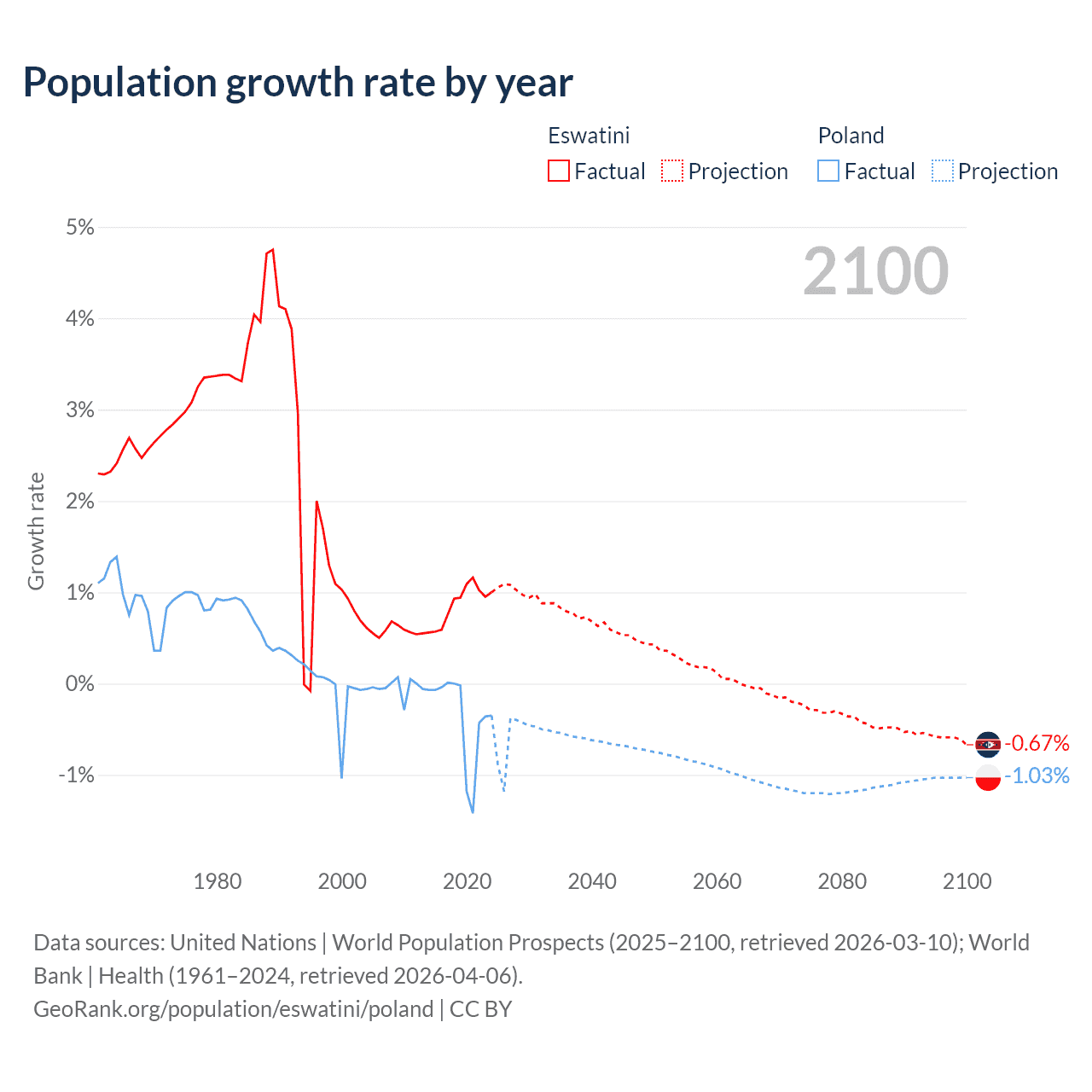 - For the last 10 years, Eswatini has had an average growth rate of +0.87% per year vs -0.36% in Poland.