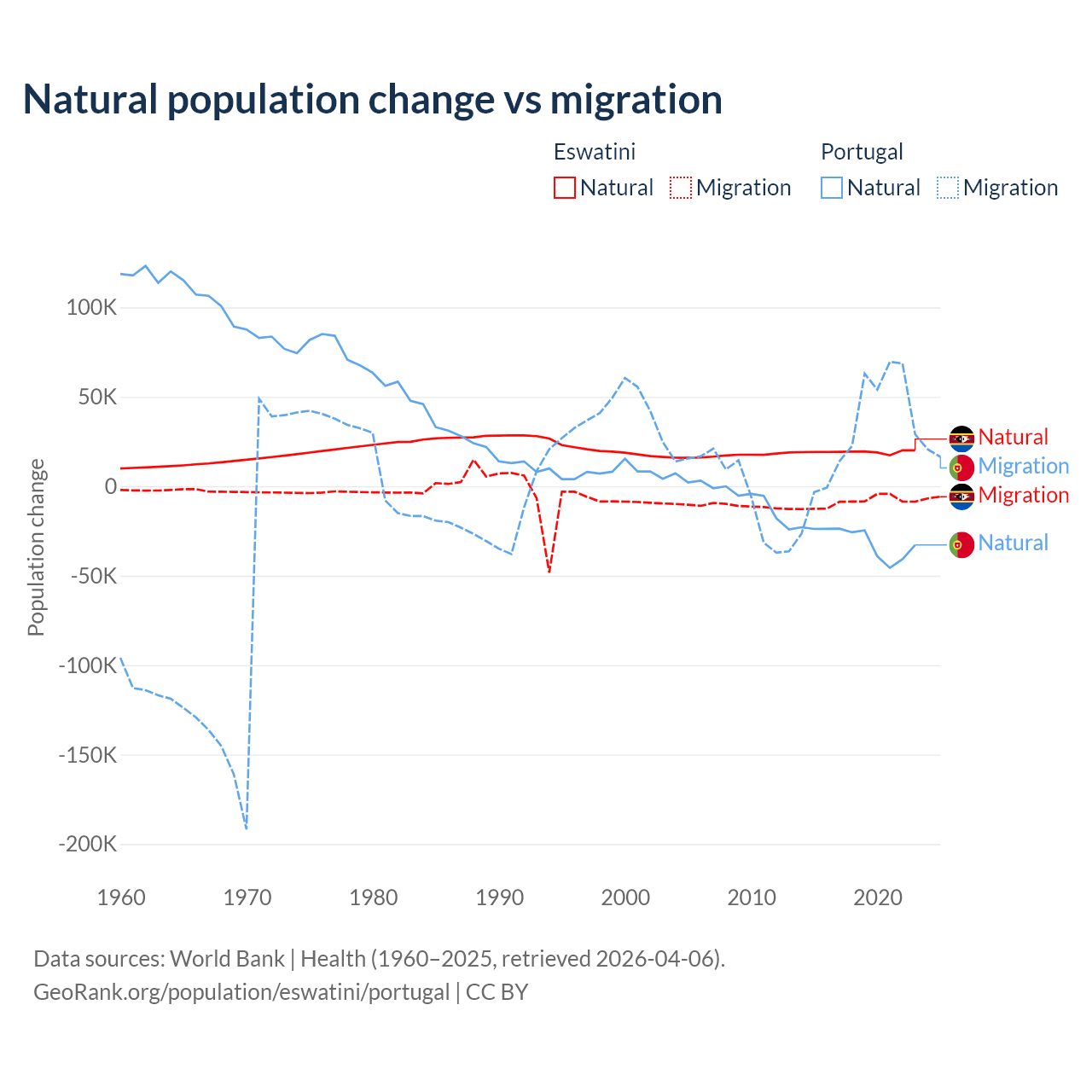 Over the last 10 years, 68.3% of the population change in Eswatini is from natural causes (a gain of 192,206 people) and 31.7% is from migration (a loss of 89,012 people). In Portugal 51% is from natural causes (a loss of 302,748 people) and 49% is from migration (a gain of 290,554 people).