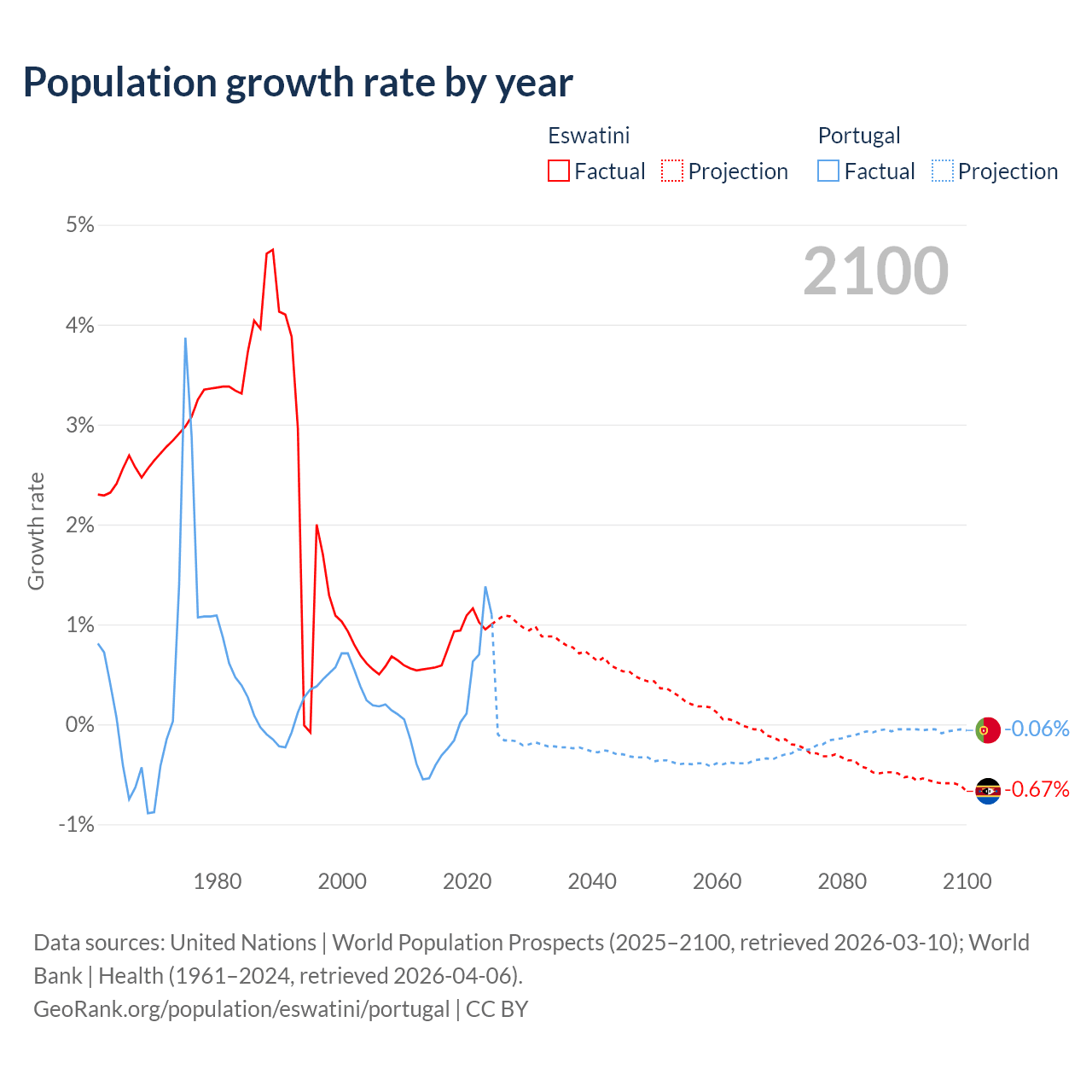 - For the last 10 years, Eswatini has had an average growth rate of +0.87% per year vs +0.21% in Portugal.
