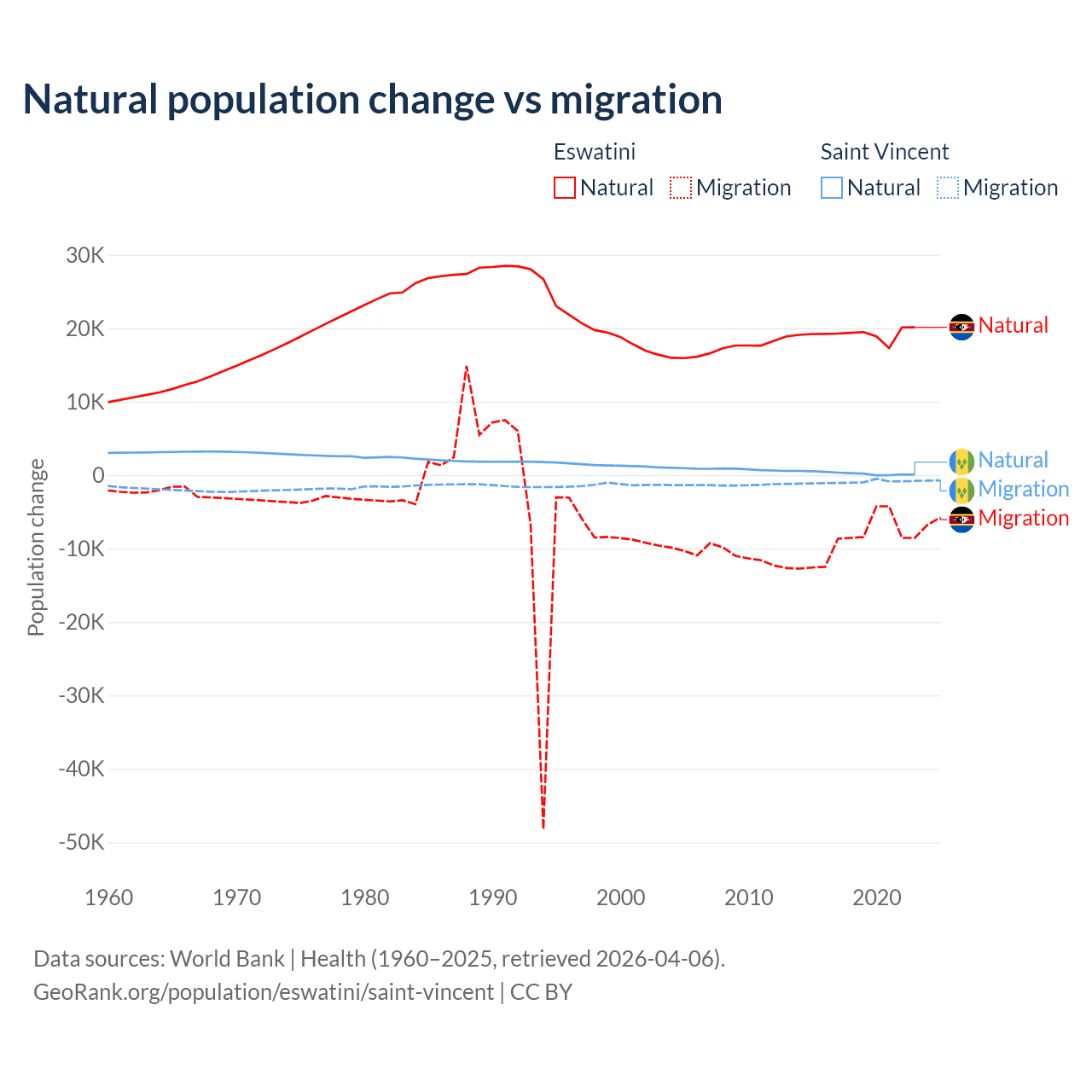 Over the last 10 years, 68.3% of the population change in Eswatini is from natural causes (a gain of 192,206 people) and 31.7% is from migration (a loss of 89,012 people). In Saint Vincent 21.2% is from natural causes (a gain of 2,525 people) and 78.8% is from migration (a loss of 9,393 people).
