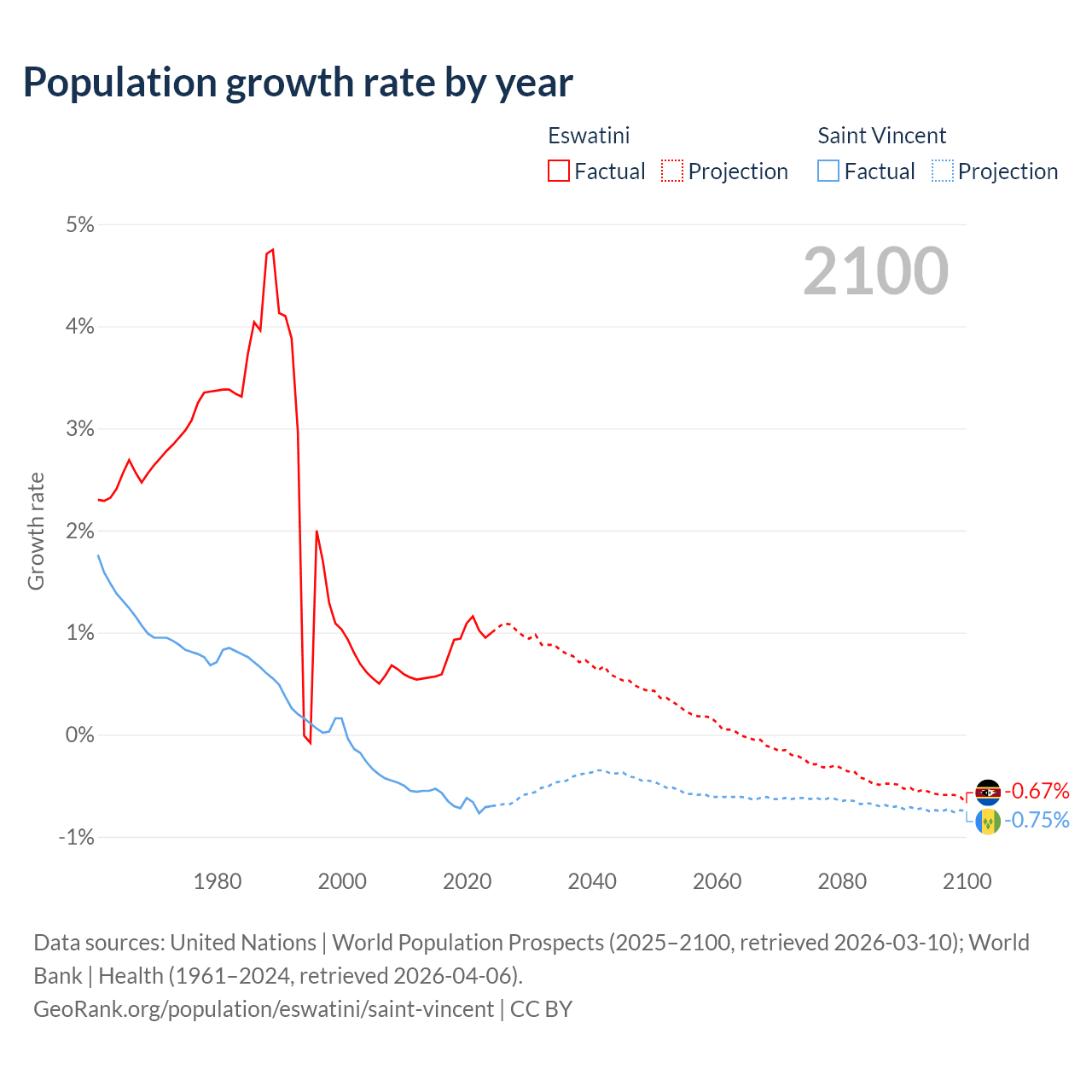 - For the last 10 years, Eswatini has had an average growth rate of +0.87% per year vs -0.65% in Saint Vincent.