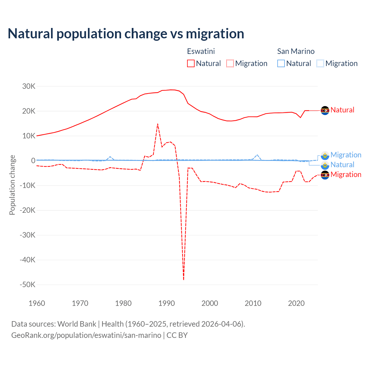 Over the last 10 years, 68.3% of the population change in Eswatini is from natural causes (a gain of 192,206 people) and 31.7% is from migration (a loss of 89,012 people). In San Marino 40.9% is from natural causes (a loss of 358 people) and 59.1% is from migration (a gain of 517 people).