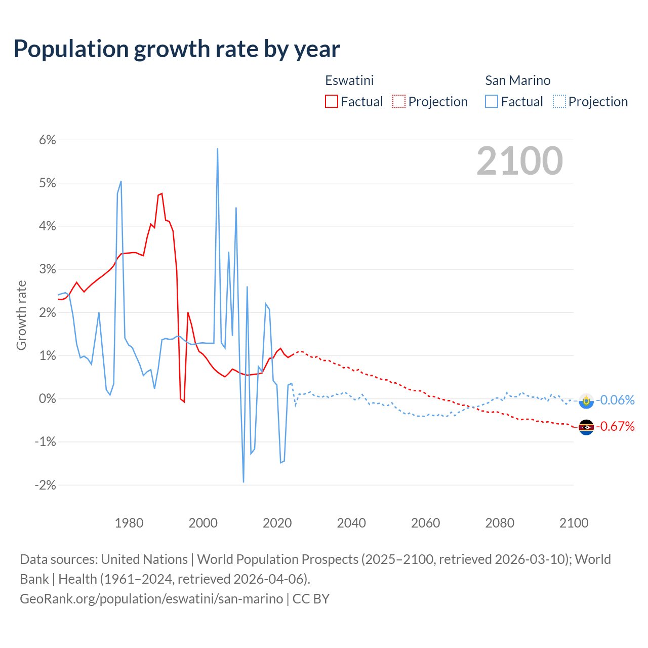 - For the last 10 years, Eswatini has had an average growth rate of +0.87% per year vs +0.26% in San Marino.