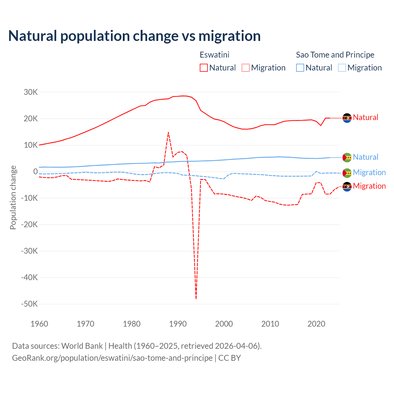 Over the last 10 years, 68.3% of the population change in Eswatini is from natural causes (a gain of 192,206 people) and 31.7% is from migration (a loss of 89,012 people). In Sao Tome and Principe 80.1% is from natural causes (a gain of 50,822 people) and 19.9% is from migration (a loss of 12,621 people).