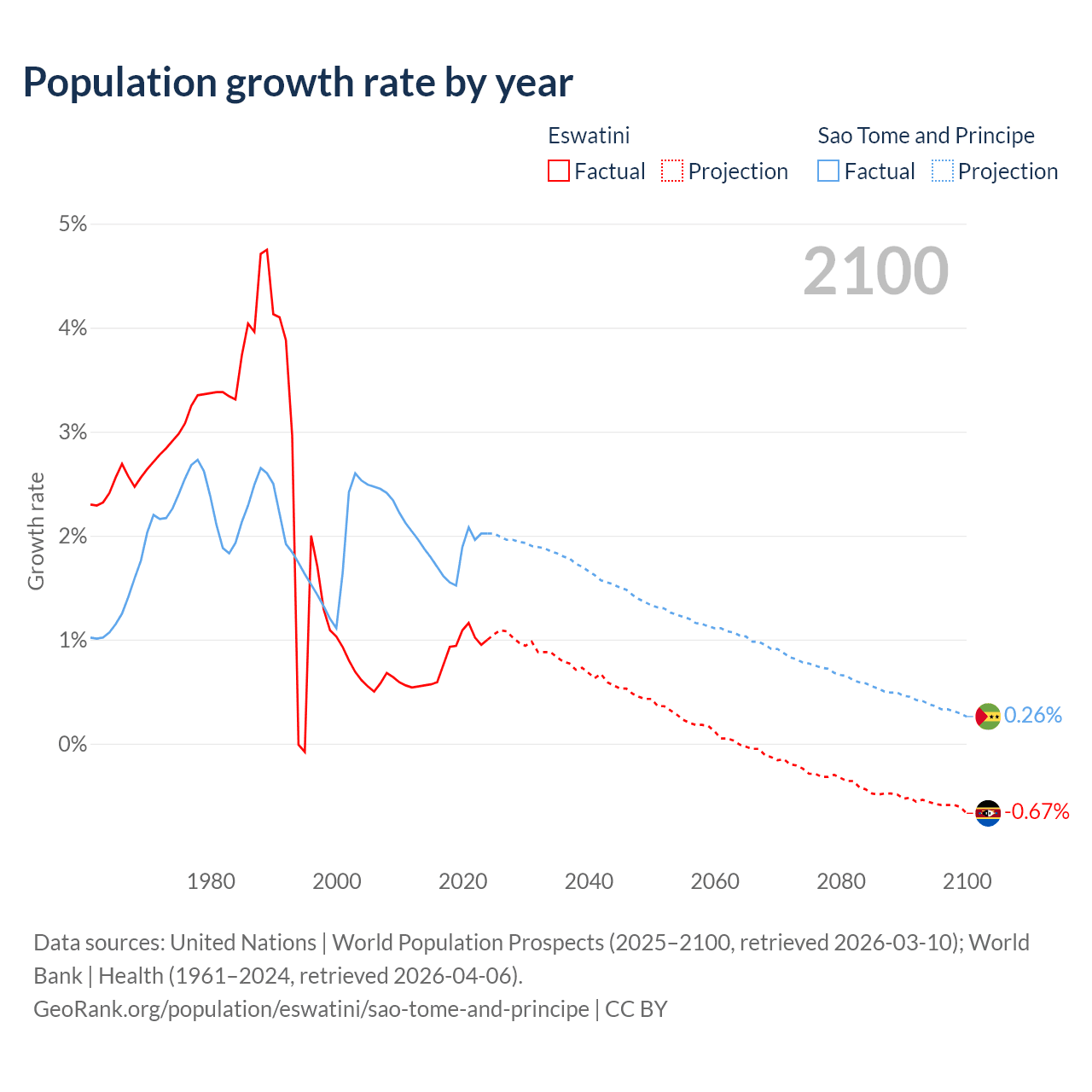 - For the last 10 years, Eswatini has had an average growth rate of +0.87% per year vs +1.82% in Sao Tome and Principe.