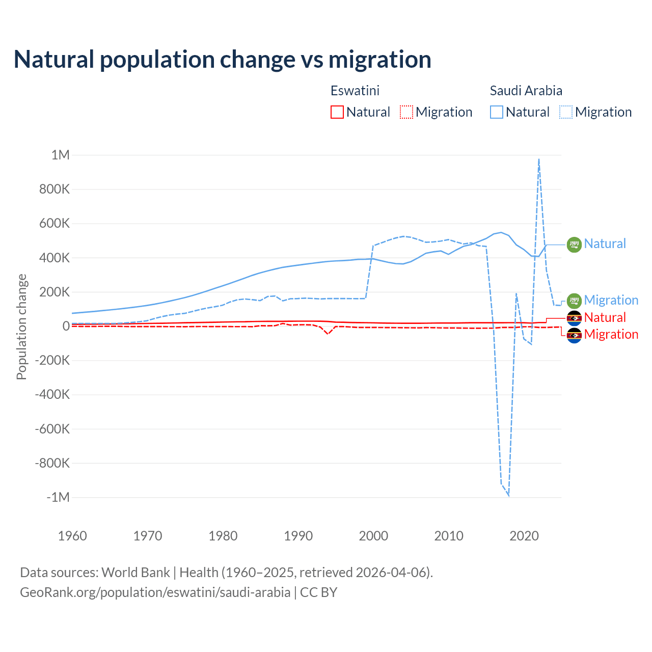 Over the last 10 years, 68.3% of the population change in Eswatini is from natural causes (a gain of 192,206 people) and 31.7% is from migration (a loss of 89,012 people). In Saudi Arabia 93.9% is from natural causes (a gain of 4,829,562 people) and 6.05% is from migration (a gain of 311,209 people).