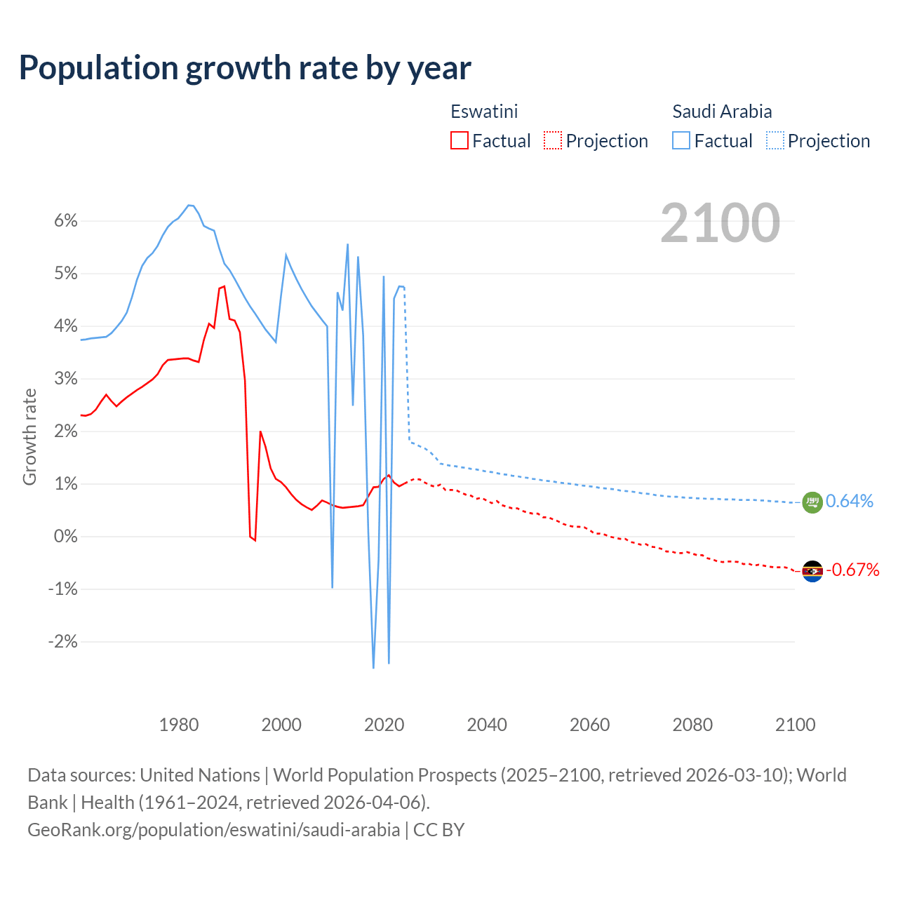 - For the last 10 years, Eswatini has had an average growth rate of +0.87% per year vs +2.3% in Saudi Arabia.