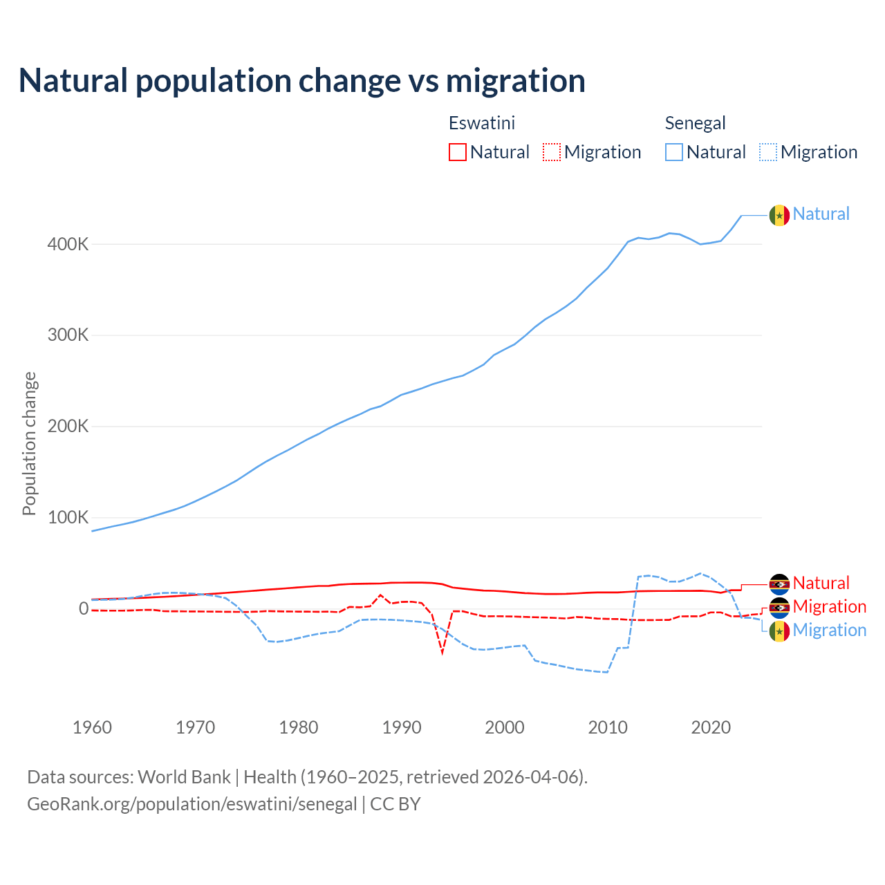 Over the last 10 years, 68.3% of the population change in Eswatini is from natural causes (a gain of 192,206 people) and 31.7% is from migration (a loss of 89,012 people). In Senegal 93.9% is from natural causes (a gain of 4,089,205 people) and 6.13% is from migration (a gain of 267,266 people).