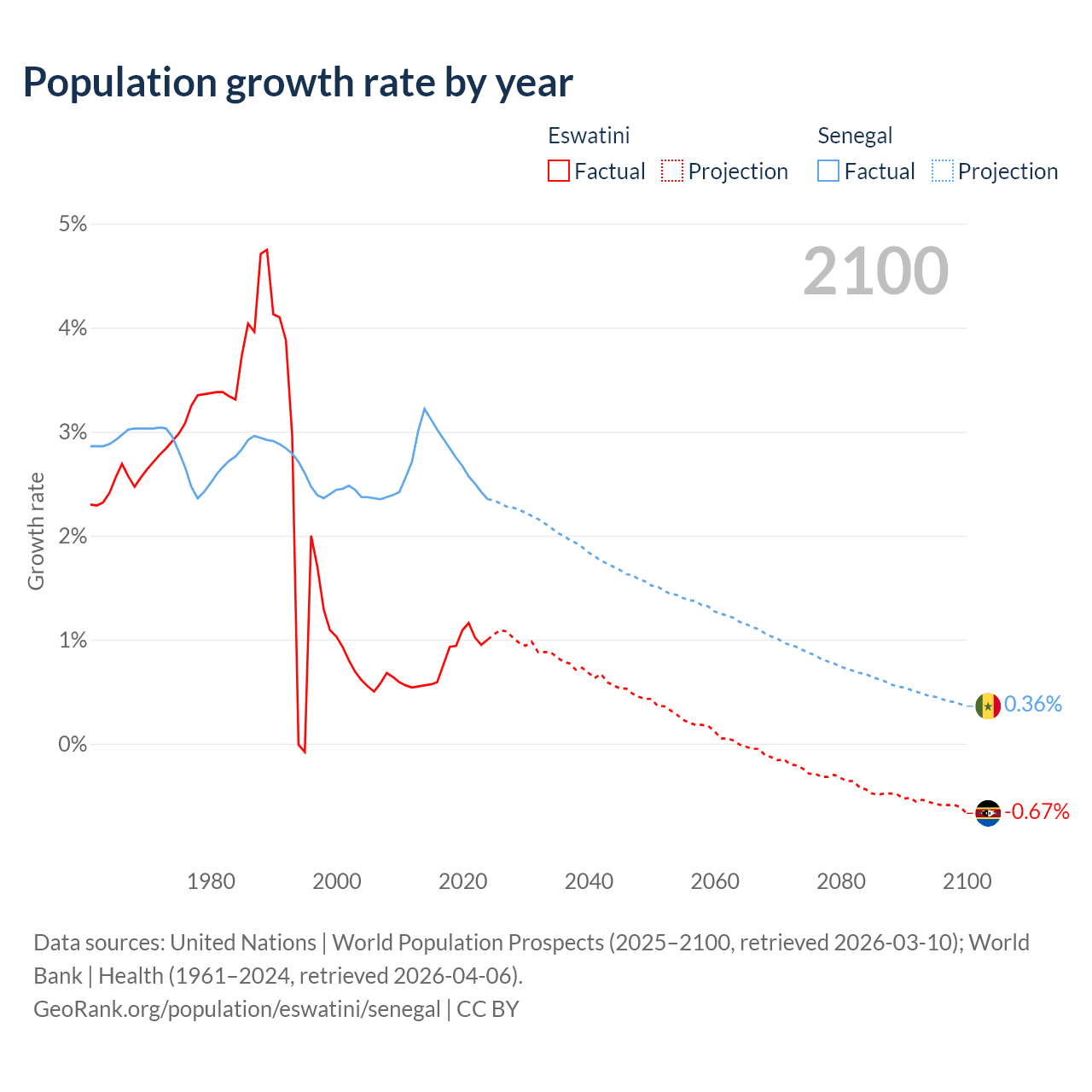 - For the last 10 years, Eswatini has had an average growth rate of +0.87% per year vs +2.76% in Senegal.