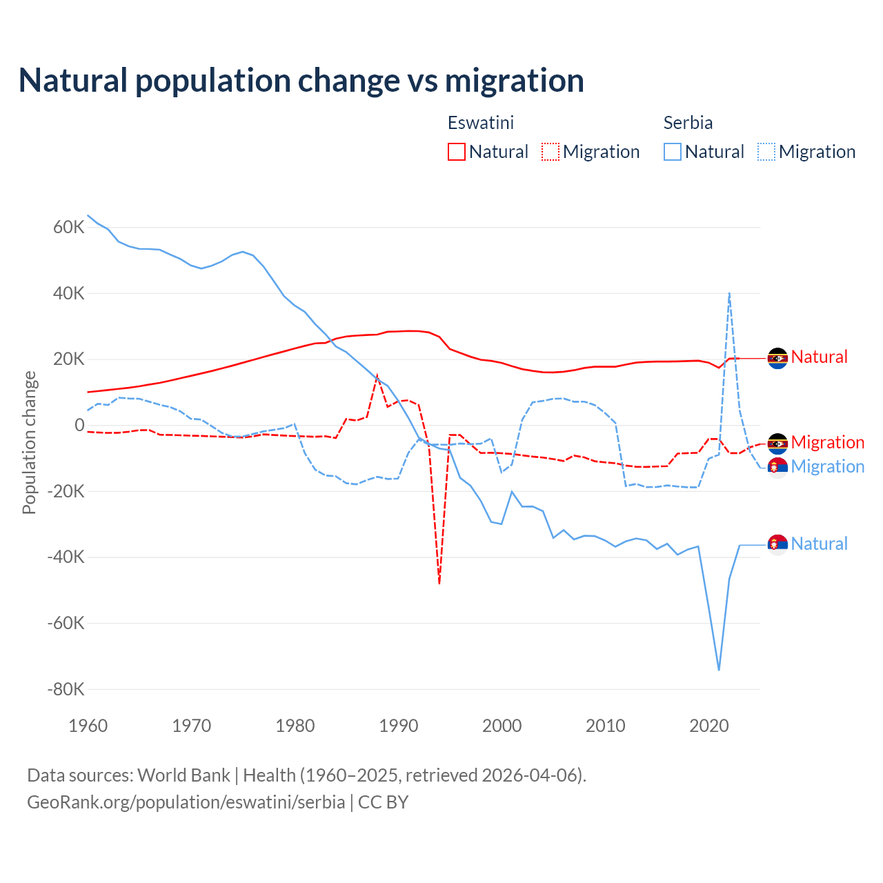 Over the last 10 years, 68.3% of the population change in Eswatini is from natural causes (a gain of 192,206 people) and 31.7% is from migration (a loss of 89,012 people). In Serbia 83.3% is from natural causes (a loss of 435,148 people) and 16.7% is from migration (a loss of 87,110 people).