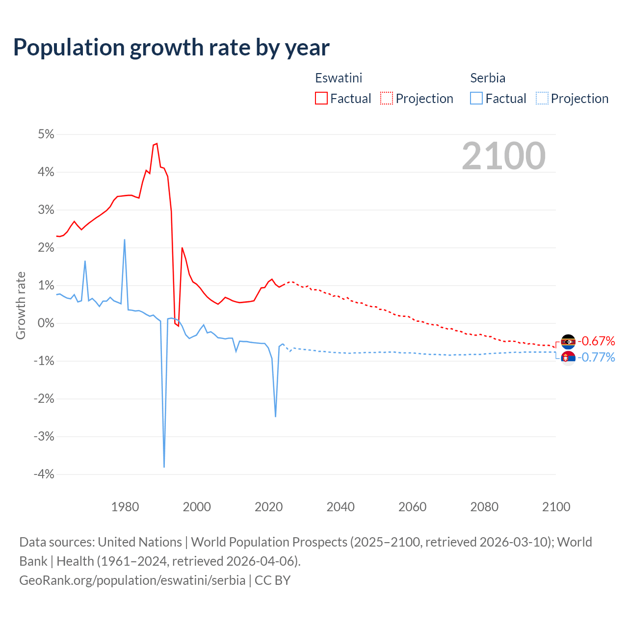 - For the last 10 years, Eswatini has had an average growth rate of +0.87% per year vs -0.76% in Serbia.