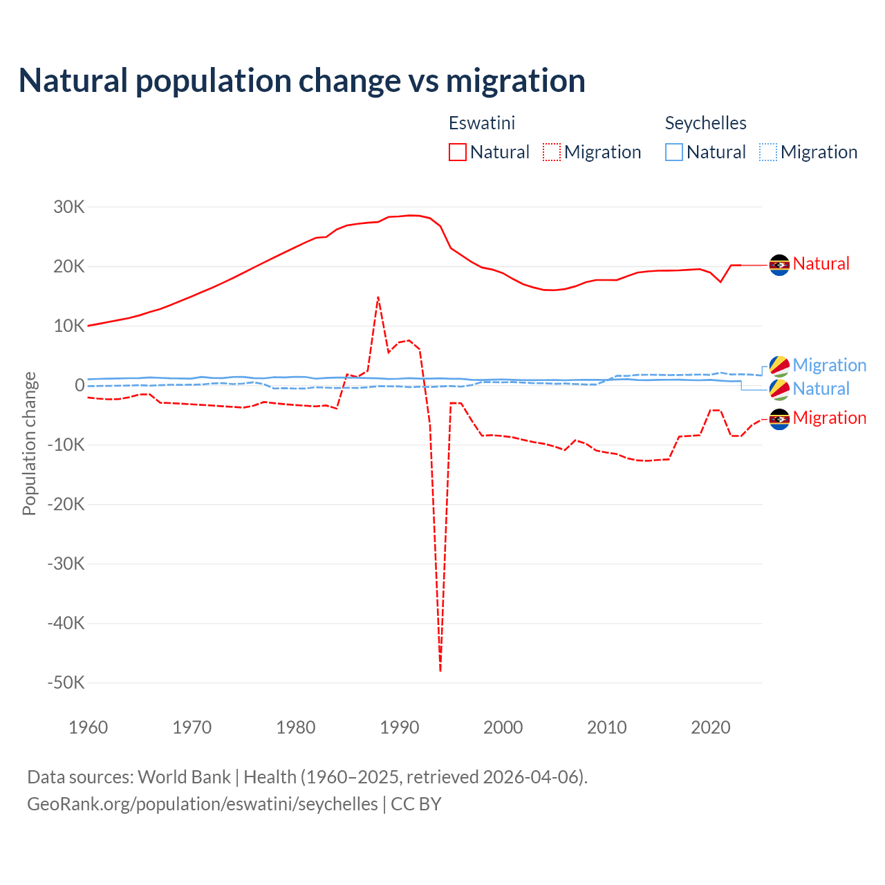 Over the last 10 years, 68.3% of the population change in Eswatini is from natural causes (a gain of 192,206 people) and 31.7% is from migration (a loss of 89,012 people). In the Seychelles 31.4% is from natural causes (a gain of 8,122 people) and 68.6% is from migration (a gain of 17,748 people).