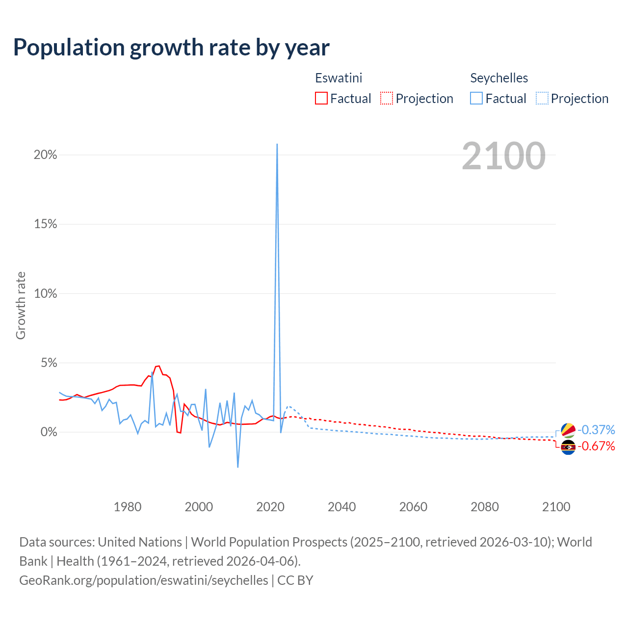 - For the last 10 years, Eswatini has had an average growth rate of +0.87% per year vs +2.9% in the Seychelles.