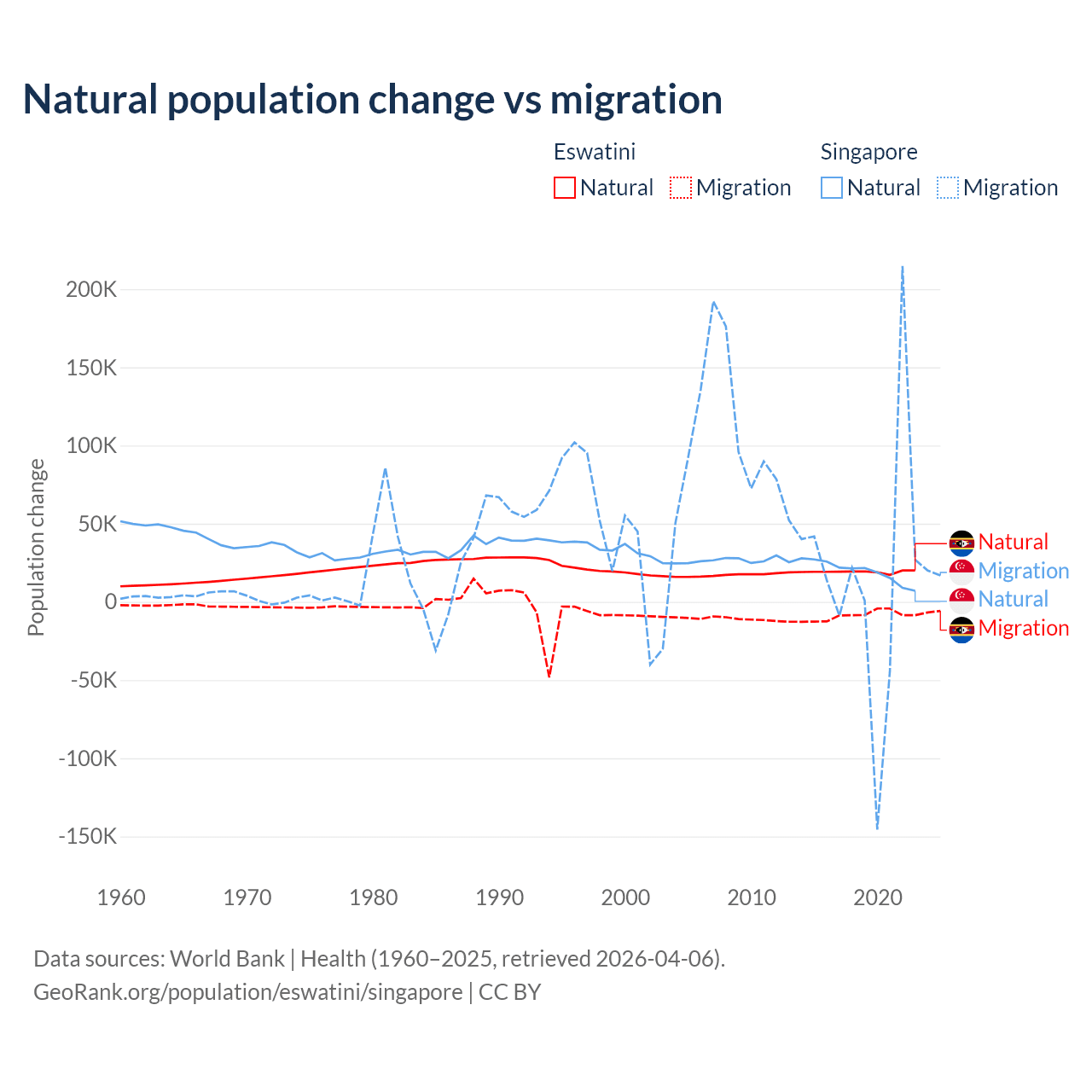 Over the last 10 years, 68.3% of the population change in Eswatini is from natural causes (a gain of 192,206 people) and 31.7% is from migration (a loss of 89,012 people). In Singapore 54.8% is from natural causes (a gain of 195,953 people) and 45.2% is from migration (a gain of 161,805 people).