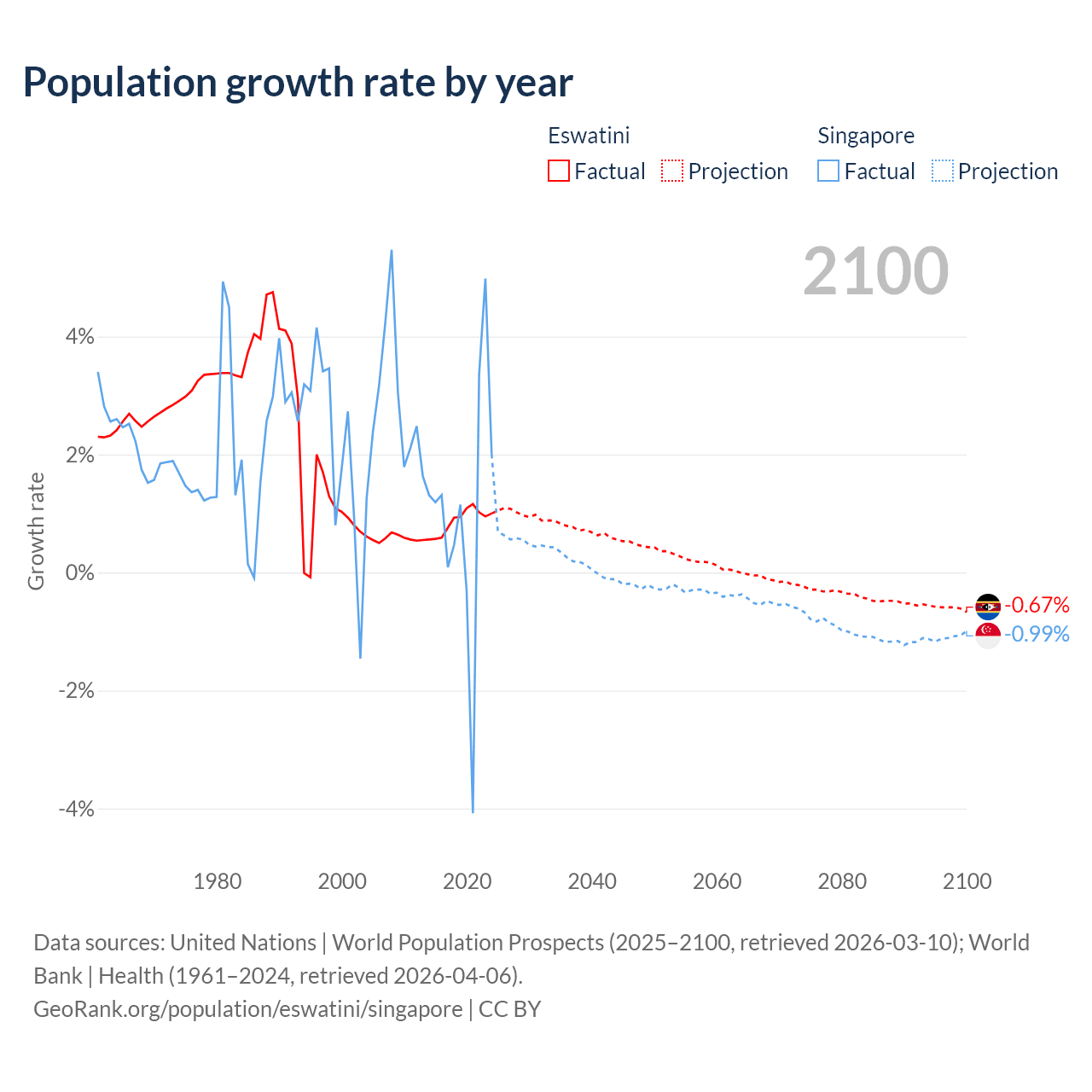 - For the last 10 years, Eswatini has had an average growth rate of +0.87% per year vs +1.04% in Singapore.