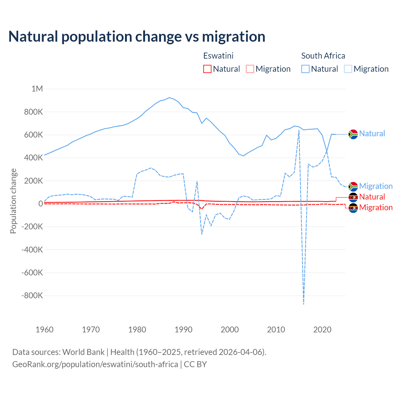 Over the last 10 years, 68.3% of the population change in Eswatini is from natural causes (a gain of 192,206 people) and 31.7% is from migration (a loss of 89,012 people). In South Africa 72.8% is from natural causes (a gain of 6,190,027 people) and 27.2% is from migration (a gain of 2,316,795 people).