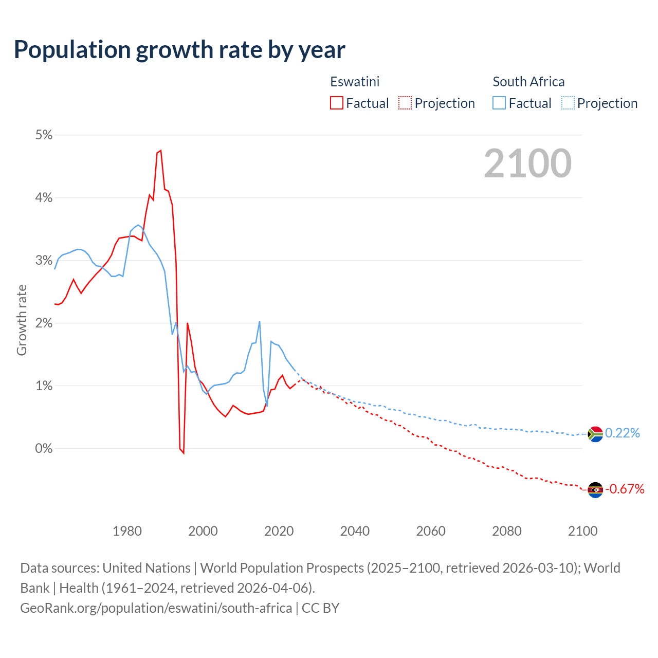 - For the last 10 years, Eswatini has had an average growth rate of +0.87% per year vs +1.44% in South Africa.