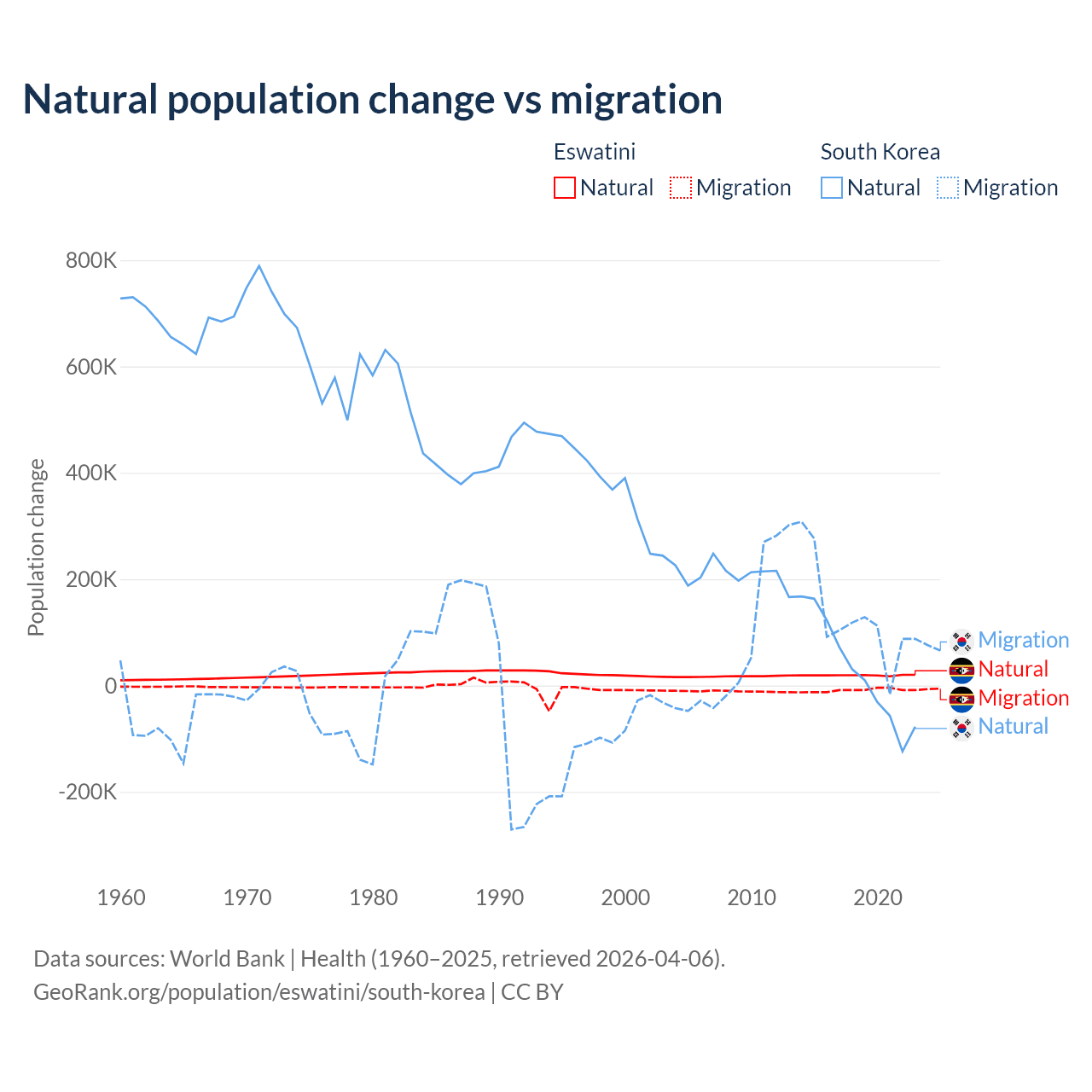 Over the last 10 years, 68.3% of the population change in Eswatini is from natural causes (a gain of 192,206 people) and 31.7% is from migration (a loss of 89,012 people). In South Korea 17.6% is from natural causes (a gain of 277,215 people) and 82.4% is from migration (a gain of 1,298,356 people).