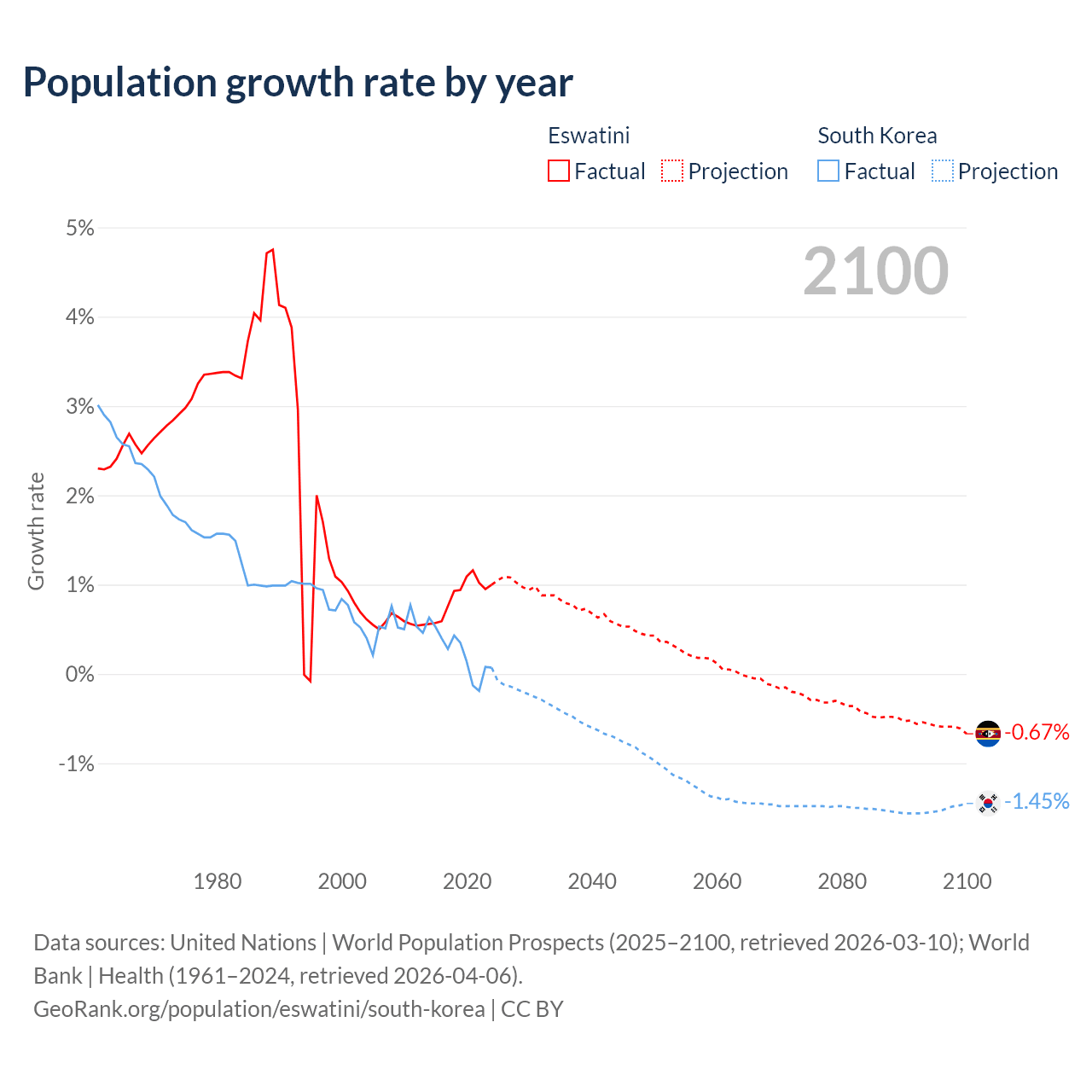 - For the last 10 years, Eswatini has had an average growth rate of +0.87% per year vs +0.24% in South Korea.
