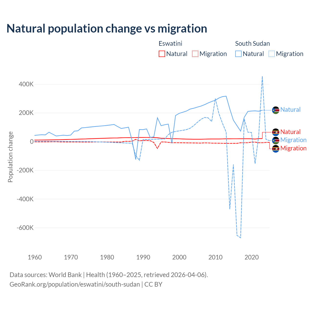 Over the last 10 years, 68.3% of the population change in Eswatini is from natural causes (a gain of 192,206 people) and 31.7% is from migration (a loss of 89,012 people). In South Sudan 57.4% is from natural causes (a gain of 1,792,135 people) and 42.6% is from migration (a loss of 1,329,606 people).