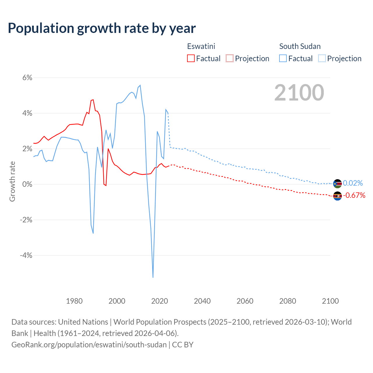 - For the last 10 years, Eswatini has had an average growth rate of +0.87% per year vs +0.65% in South Sudan.