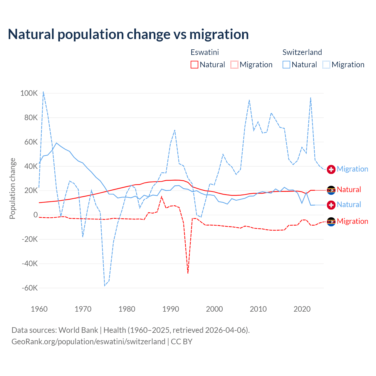 Over the last 10 years, 68.3% of the population change in Eswatini is from natural causes (a gain of 192,206 people) and 31.7% is from migration (a loss of 89,012 people). In Switzerland 21.6% is from natural causes (a gain of 165,354 people) and 78.4% is from migration (a gain of 600,145 people).
