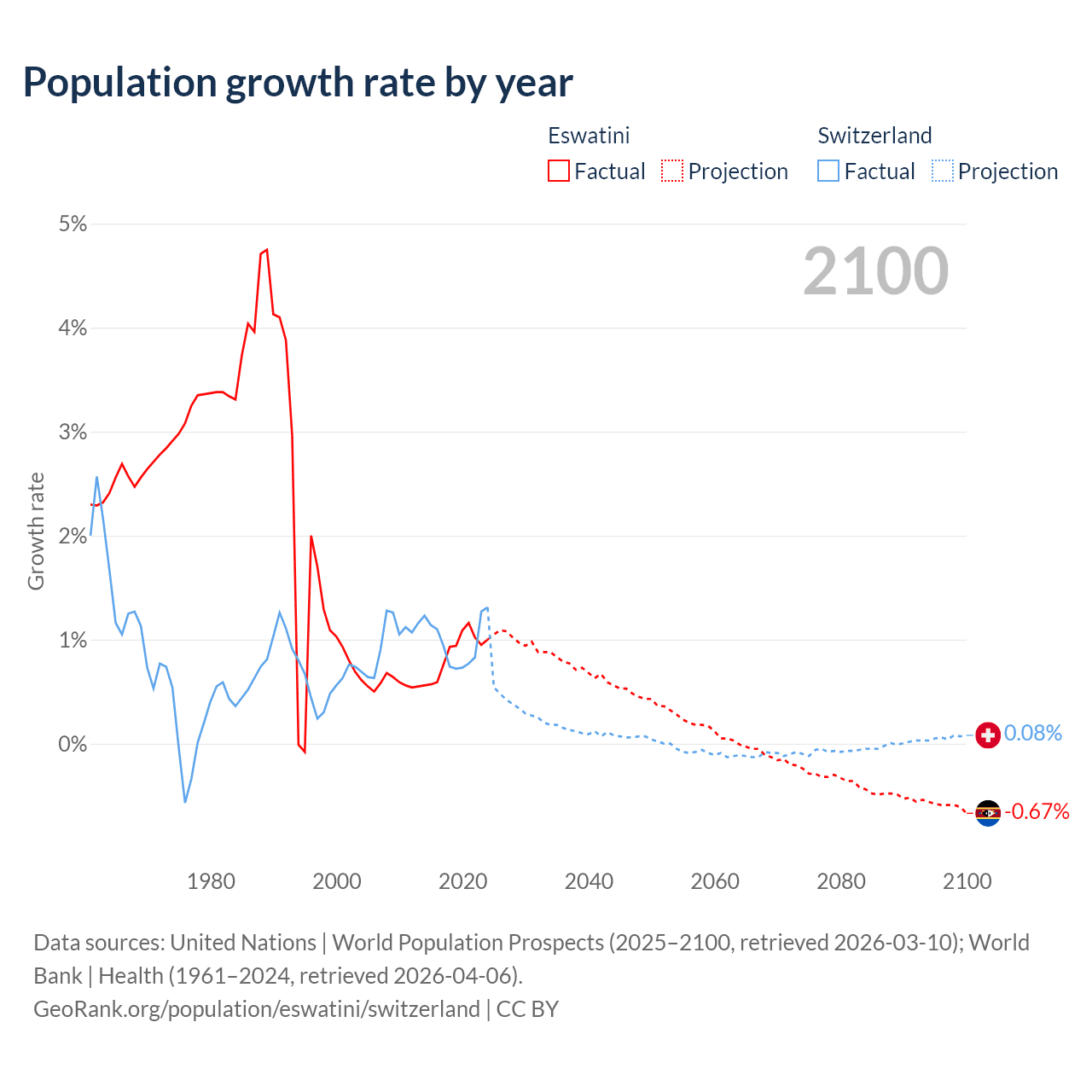 - For the last 10 years, Eswatini has had an average growth rate of +0.87% per year vs +0.98% in Switzerland.