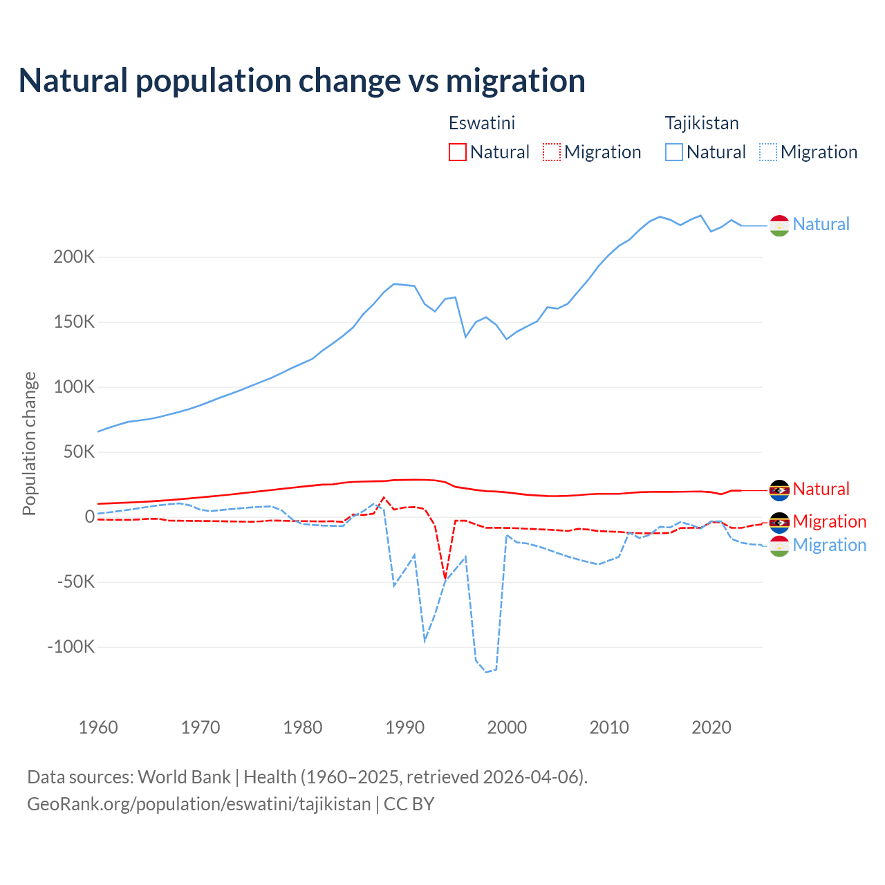 Over the last 10 years, 68.3% of the population change in Eswatini is from natural causes (a gain of 192,206 people) and 31.7% is from migration (a loss of 89,012 people). In Tajikistan 96% is from natural causes (a gain of 2,266,045 people) and 3.95% is from migration (a loss of 93,205 people).