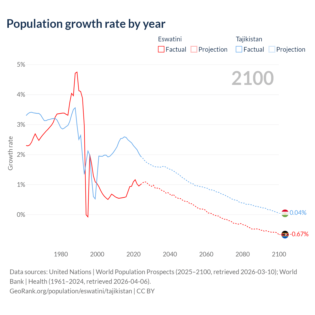 - For the last 10 years, Eswatini has had an average growth rate of +0.87% per year vs +2.33% in Tajikistan.