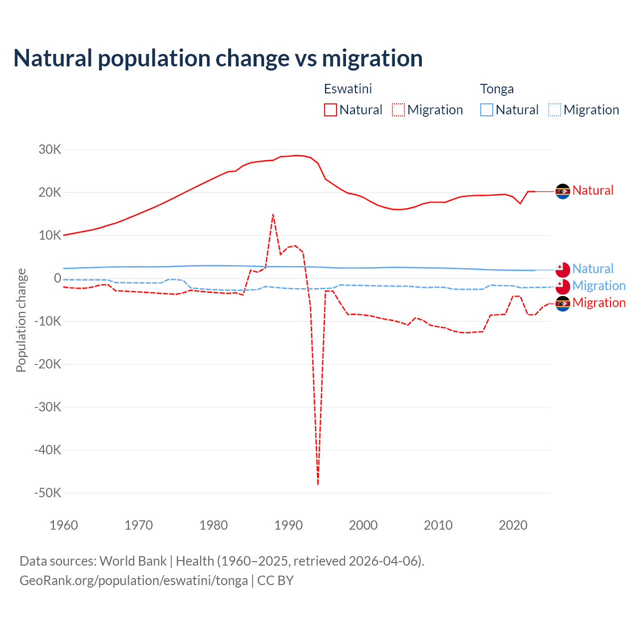 Over the last 10 years, 68.3% of the population change in Eswatini is from natural causes (a gain of 192,206 people) and 31.7% is from migration (a loss of 89,012 people). In Tonga 46.9% is from natural causes (a gain of 18,919 people) and 53.1% is from migration (a loss of 21,384 people).