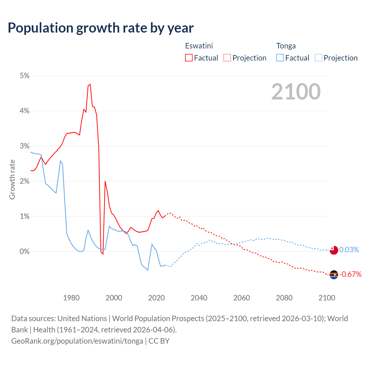 - For the last 10 years, Eswatini has had an average growth rate of +0.87% per year vs -0.25% in Tonga.