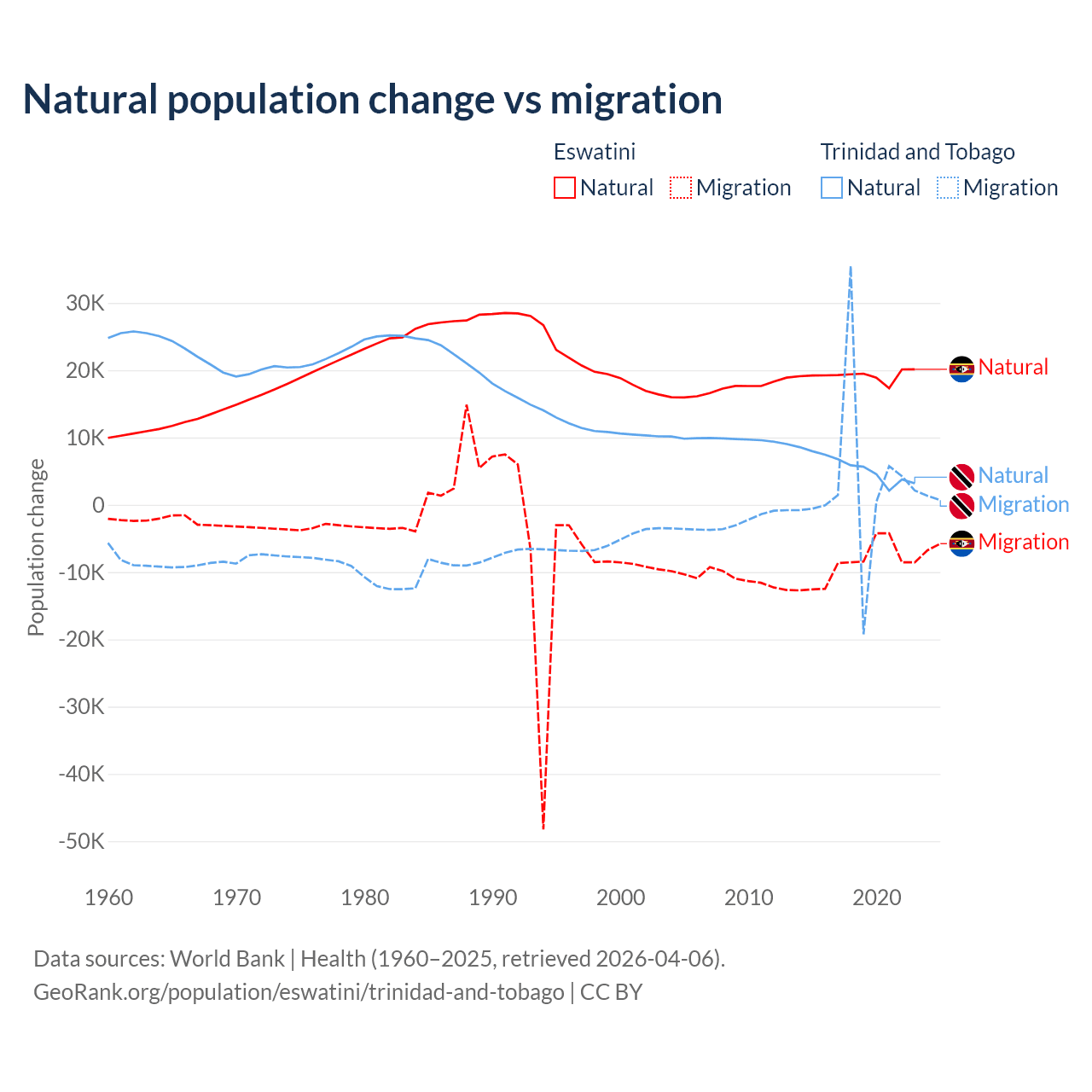 Over the last 10 years, 68.3% of the population change in Eswatini is from natural causes (a gain of 192,206 people) and 31.7% is from migration (a loss of 89,012 people). In Trinidad and Tobago 66% is from natural causes (a gain of 55,887 people) and 34% is from migration (a gain of 28,785 people).
