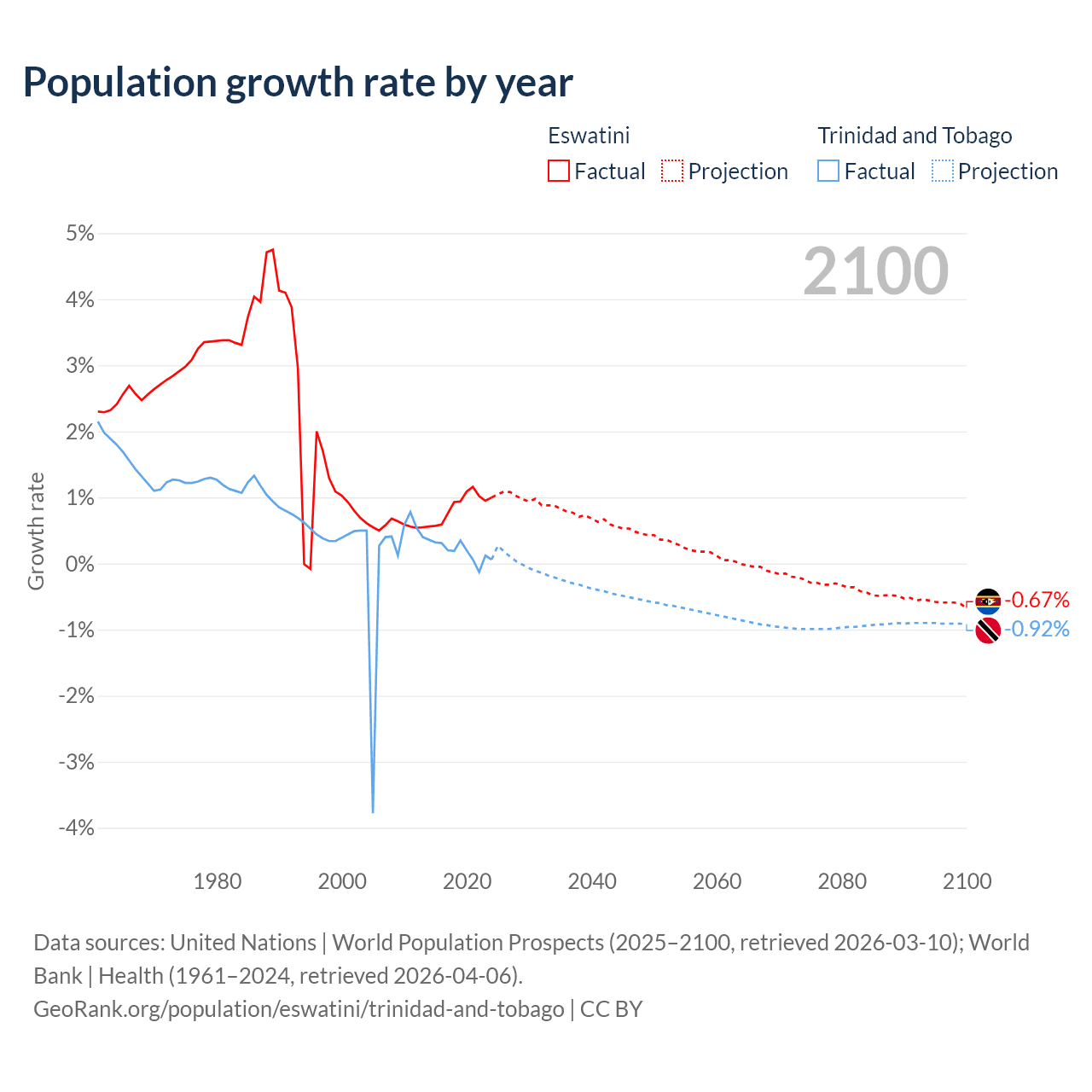 - For the last 10 years, Eswatini has had an average growth rate of +0.87% per year vs +0.19% in Trinidad and Tobago.