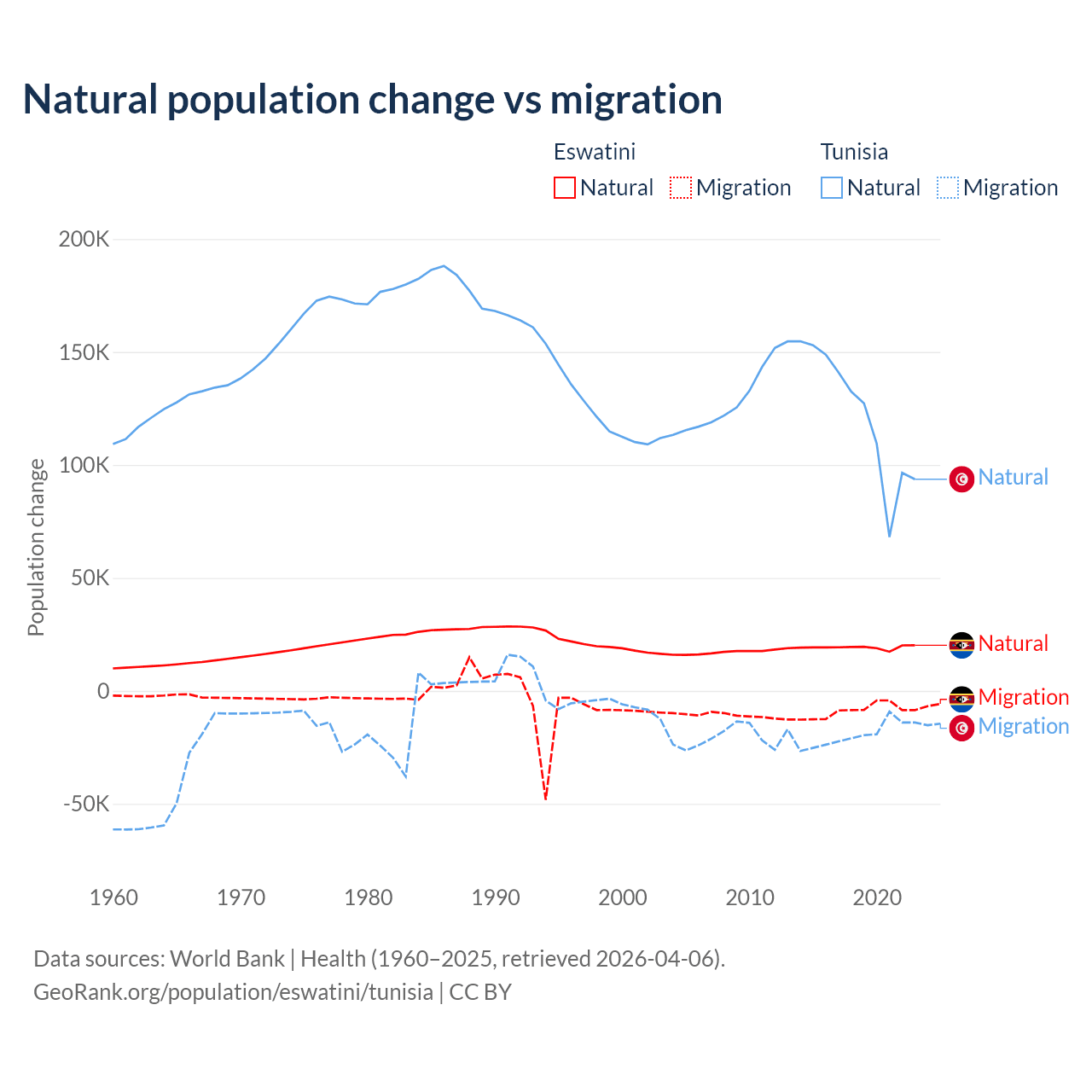 Over the last 10 years, 68.3% of the population change in Eswatini is from natural causes (a gain of 192,206 people) and 31.7% is from migration (a loss of 89,012 people). In Tunisia 86.3% is from natural causes (a gain of 1,225,079 people) and 13.7% is from migration (a loss of 195,011 people).