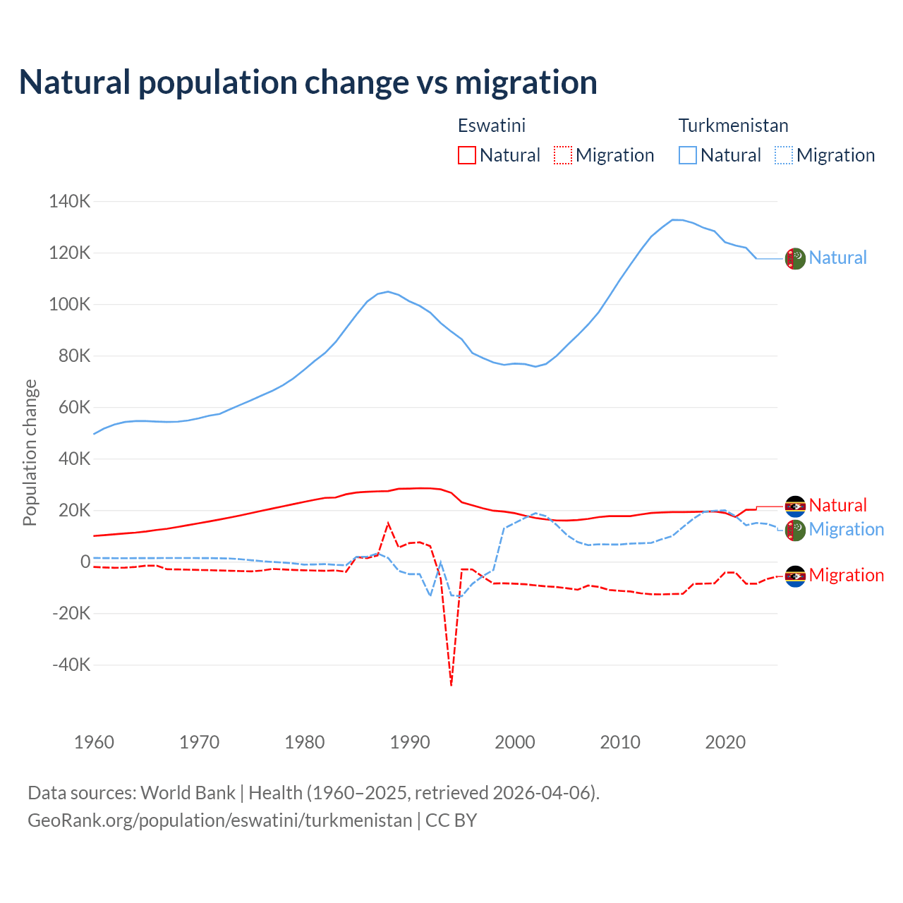 Over the last 10 years, 68.3% of the population change in Eswatini is from natural causes (a gain of 192,206 people) and 31.7% is from migration (a loss of 89,012 people). In Turkmenistan 89.2% is from natural causes (a gain of 1,270,228 people) and 10.8% is from migration (a gain of 154,379 people).