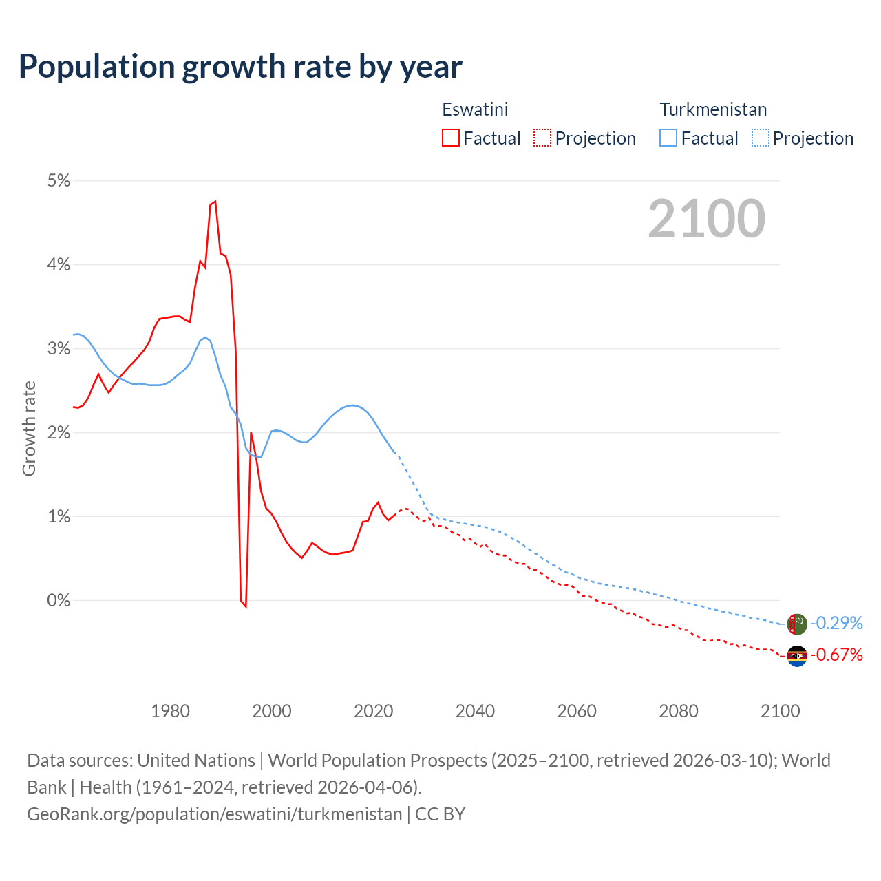 - For the last 10 years, Eswatini has had an average growth rate of +0.87% per year vs +2.14% in Turkmenistan.