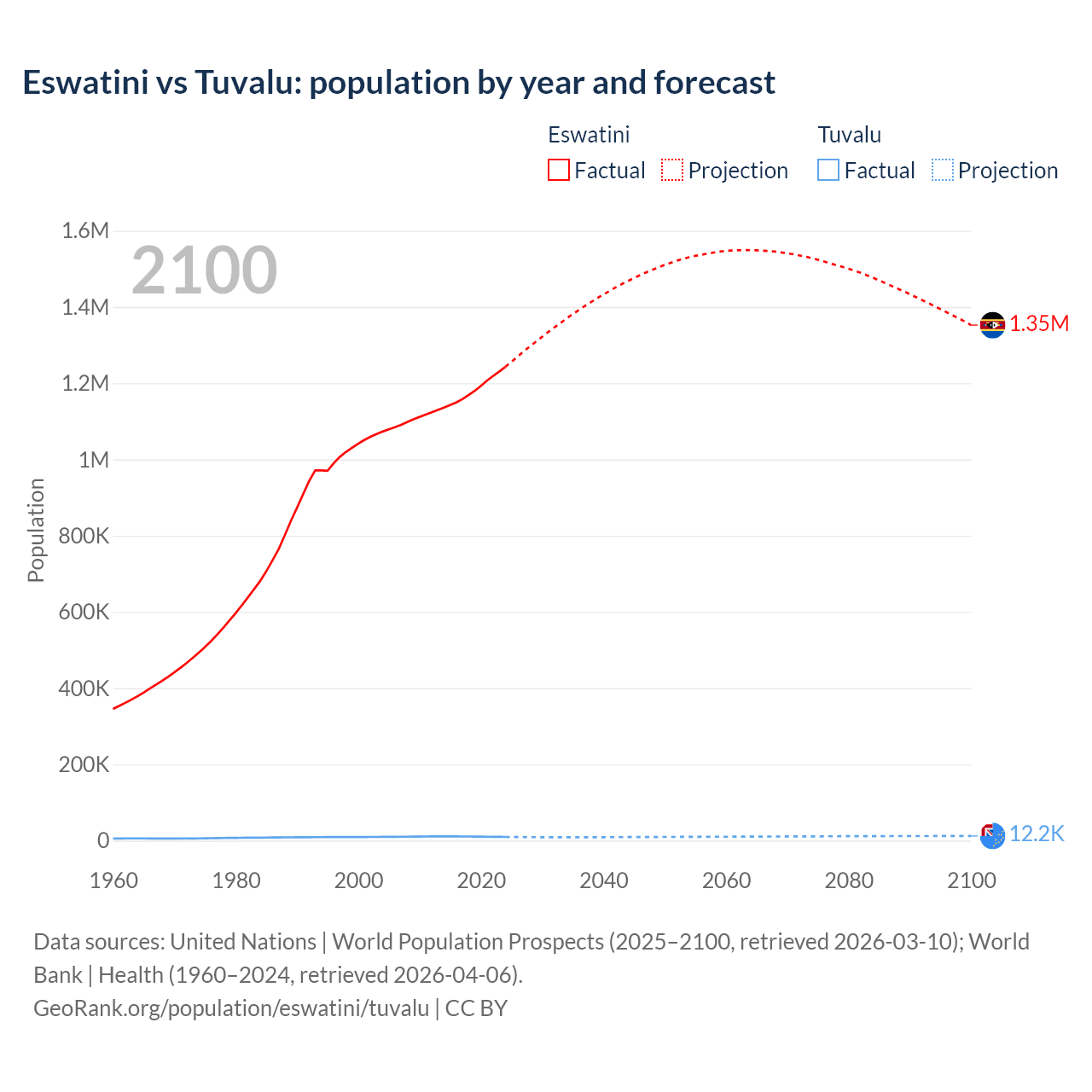 The latest officially reported population of Eswatini was 1,242,822 in 2024 vs 9,646 people in Tuvalu in 2024. In 2026, based on the adjusted UN estimation, the current Eswatini's population is 1,273,390 people compared to 9,341 in Tuvalu.