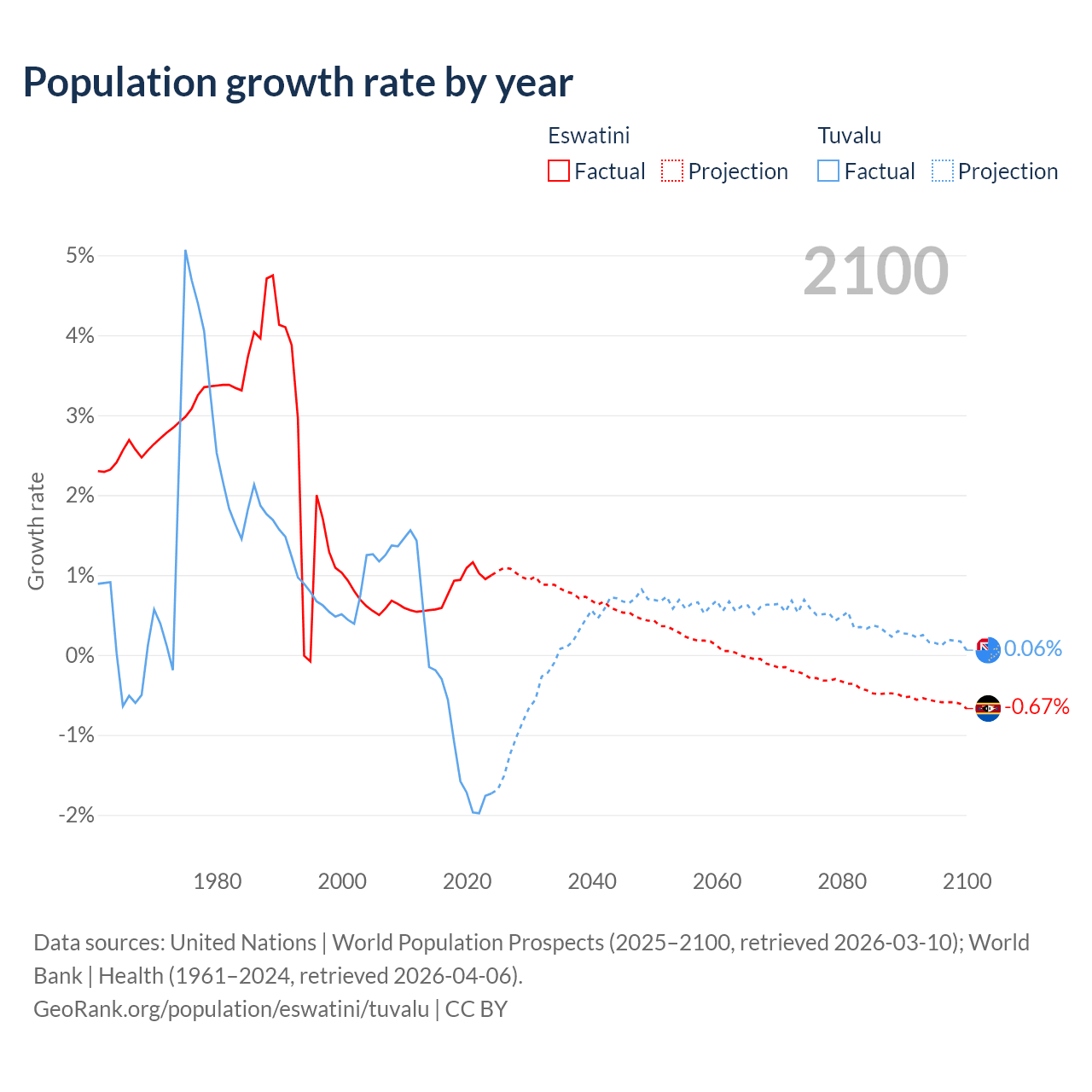 - For the last 10 years, Eswatini has had an average growth rate of +0.87% per year vs -1.19% in Tuvalu.