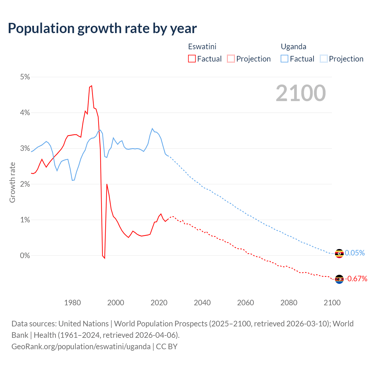 - For the last 10 years, Eswatini has had an average growth rate of +0.87% per year vs +3.21% in Uganda.