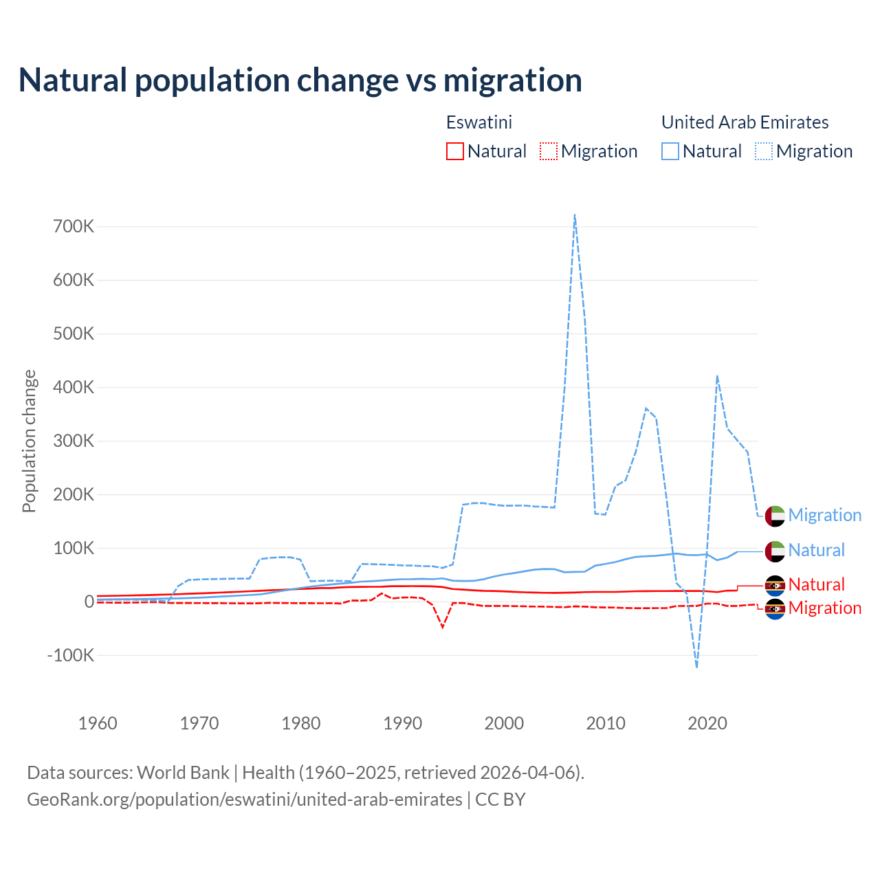 Over the last 10 years, 68.3% of the population change in Eswatini is from natural causes (a gain of 192,206 people) and 31.7% is from migration (a loss of 89,012 people). In the United Arab Emirates 30.5% is from natural causes (a gain of 857,996 people) and 69.5% is from migration (a gain of 1,958,520 people).